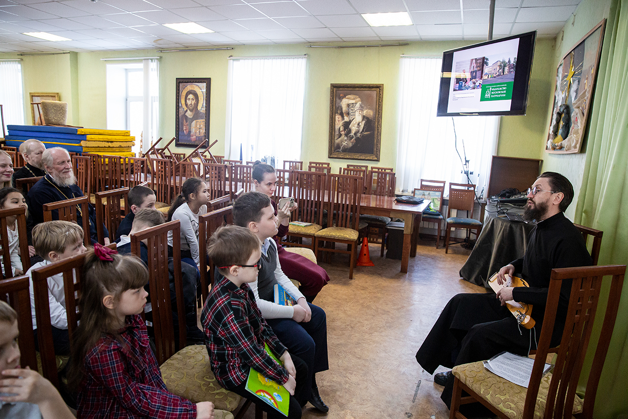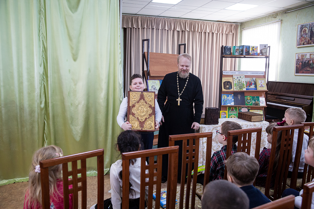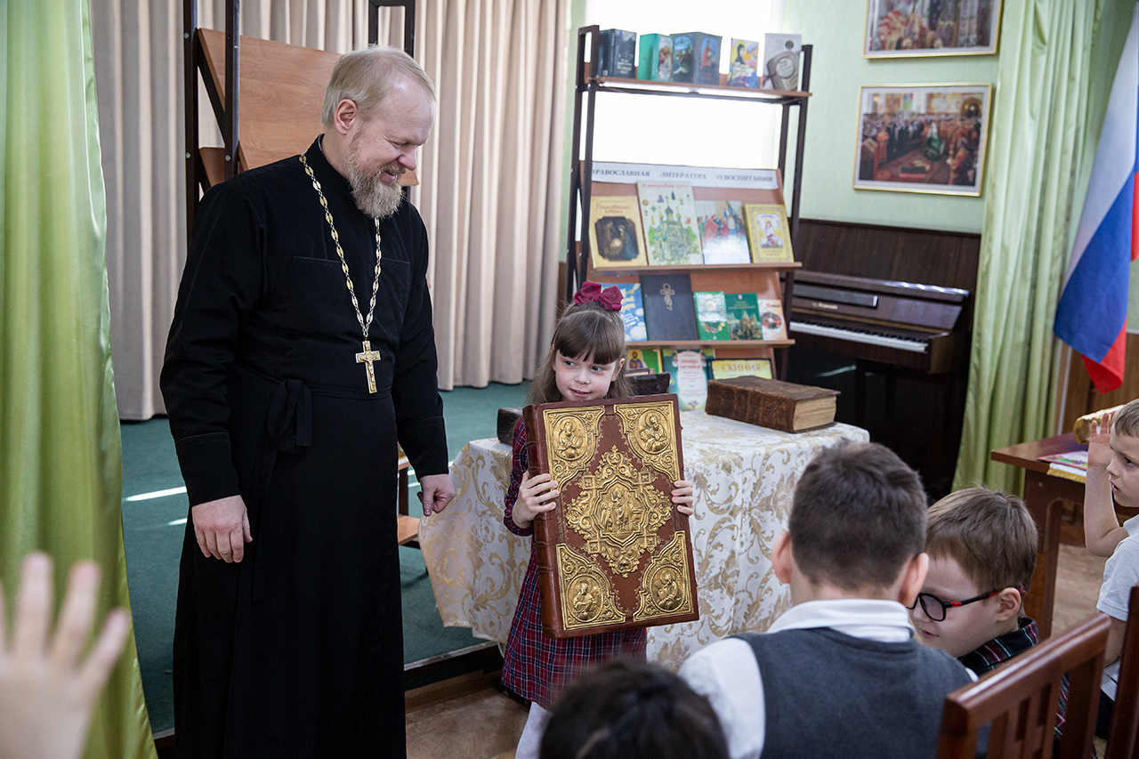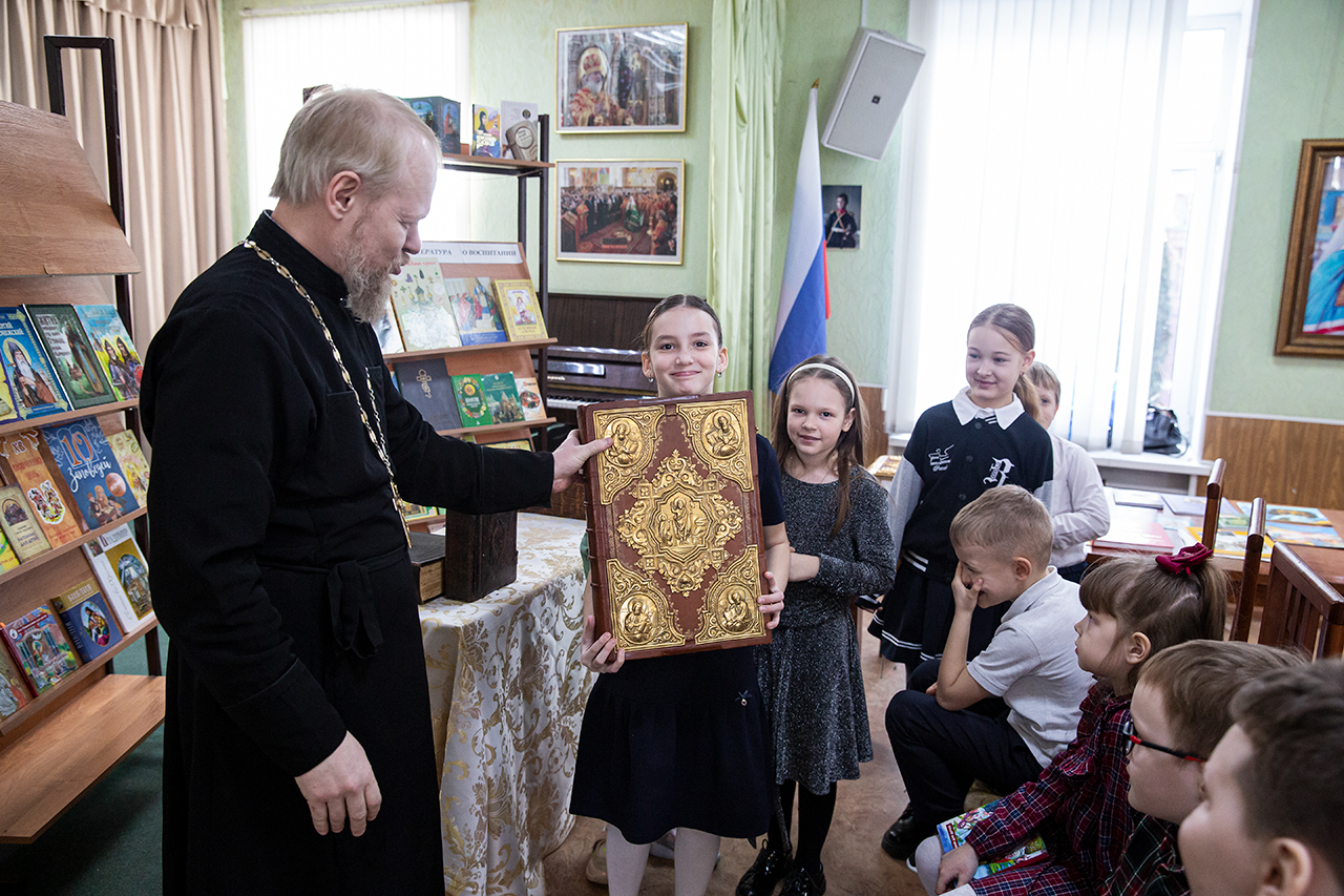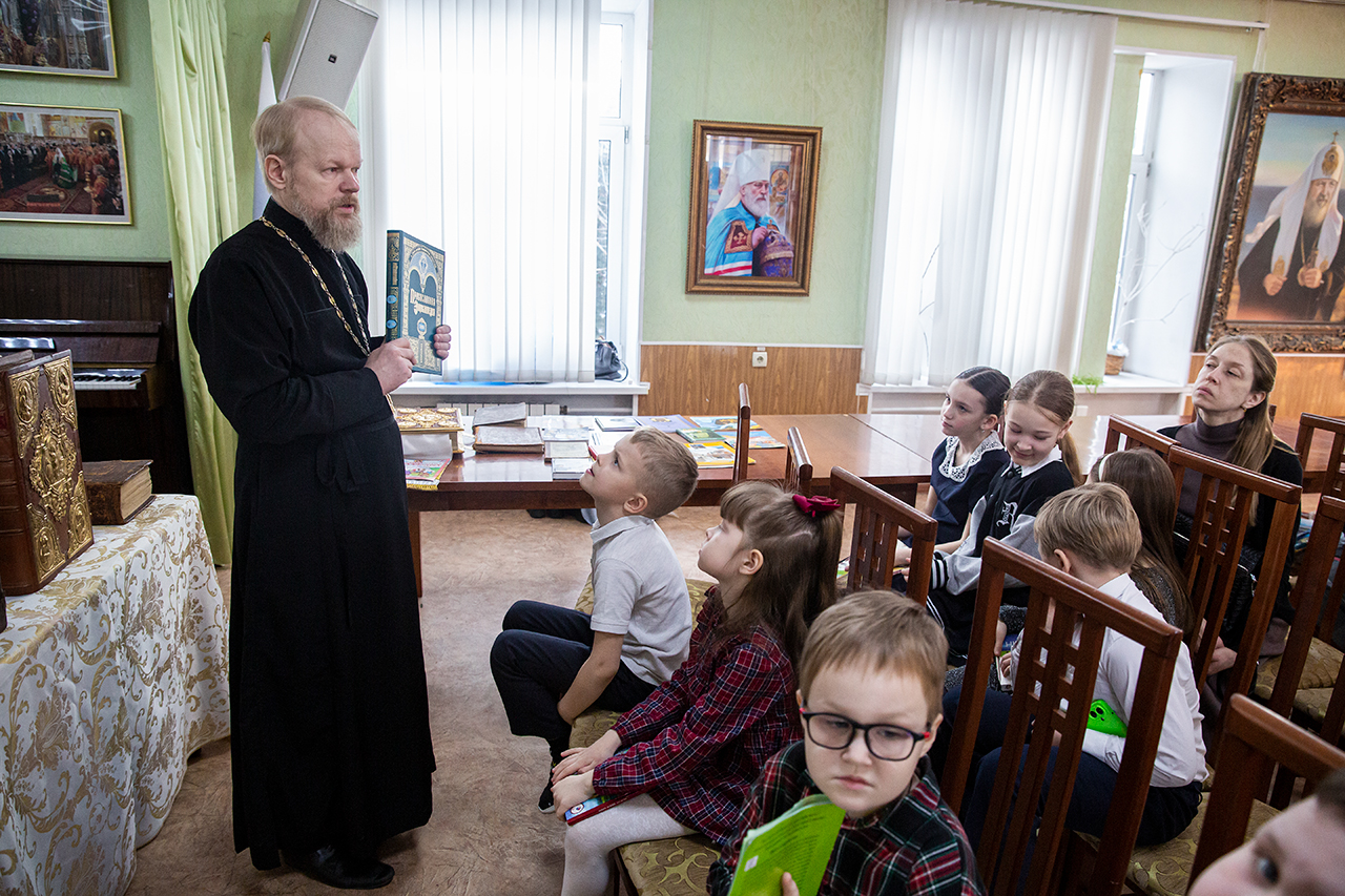 В конференц-зале, где была организована книжная мини-экспозиция, учащимся и родителям показали презентацию об истории праздника и книгопечатания. Клирик собора священник Димитрий Медведев рассказал ребятам о богослужебных книгах и современных изданиях Издательства Московской Патриархии. Директор воскресной школы Анна Александровна Медведева познакомила с учебной литературой и периодическими изданиями сборников XIX века. У ребят была возможность подержать в руках Евангелие XVIII века.