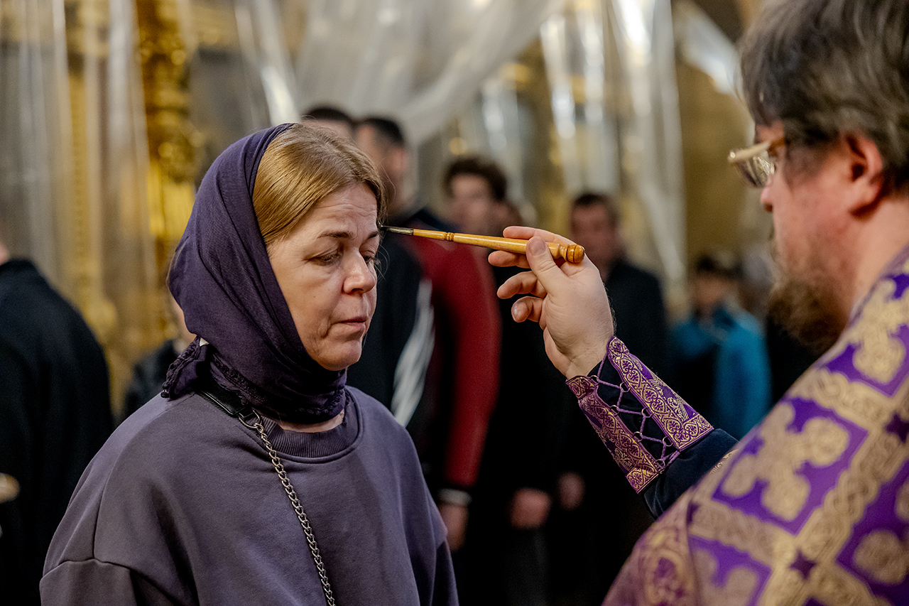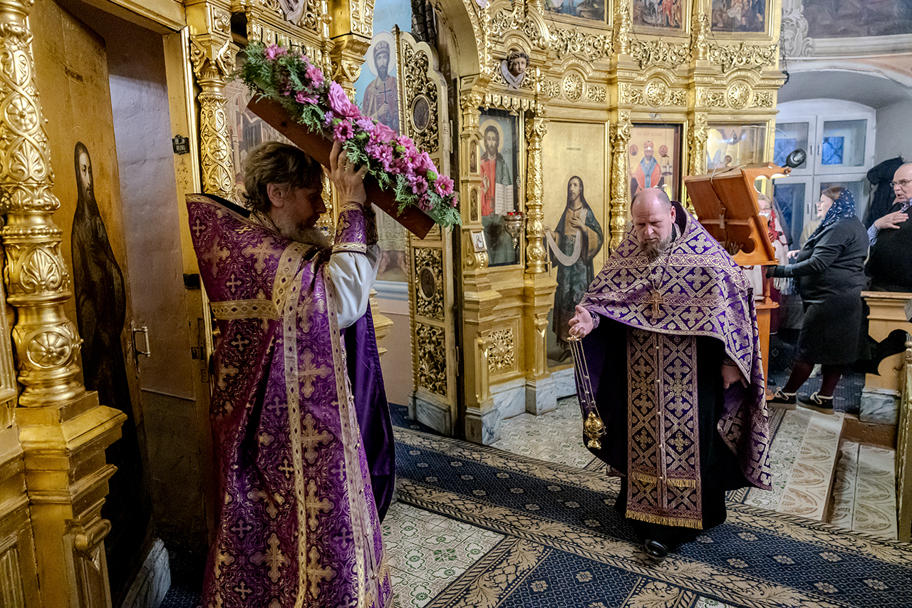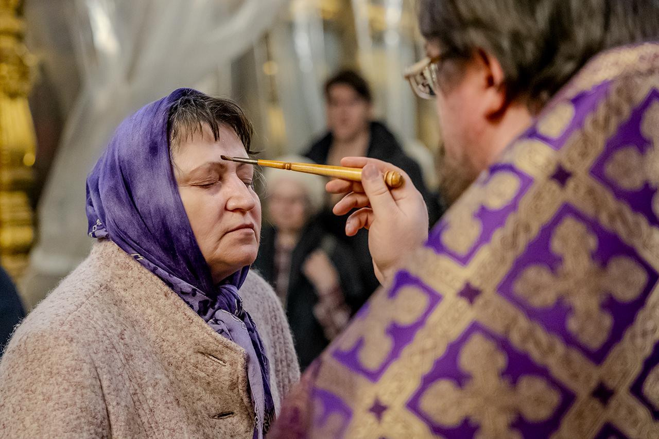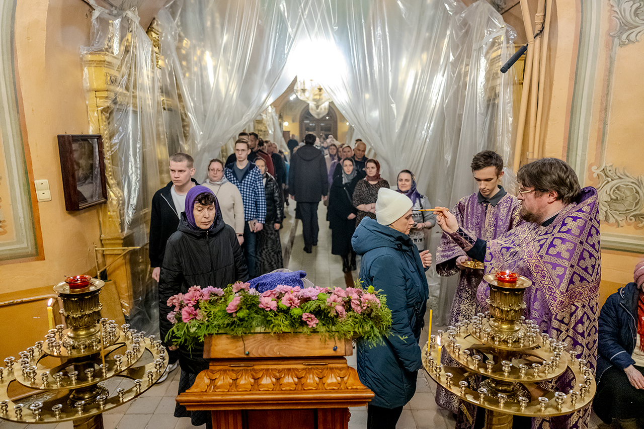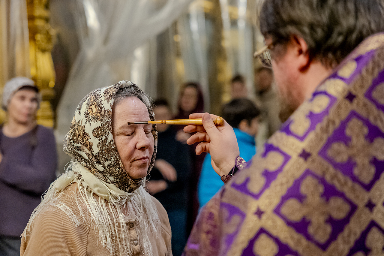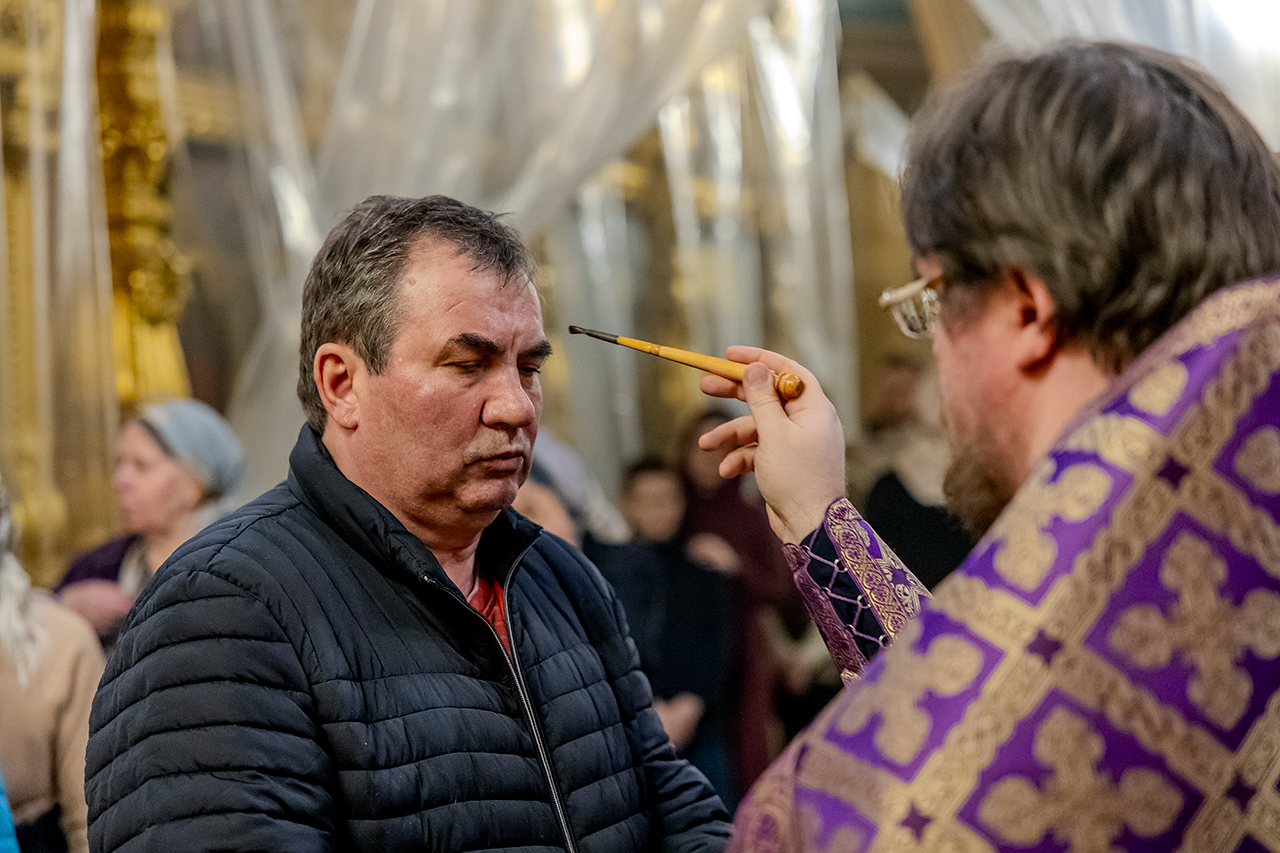 После великого славословия Крест Господень был торжественно изнесен из алтаря в центр храма под пение «Кресту Твоему покланяемся, Владыко, и Святое Воскресение Твое славим». Молящиеся в храме приложились ко Кресту, всех помазали освященным елеем.