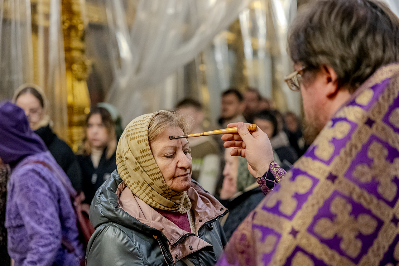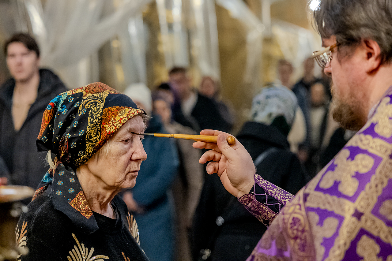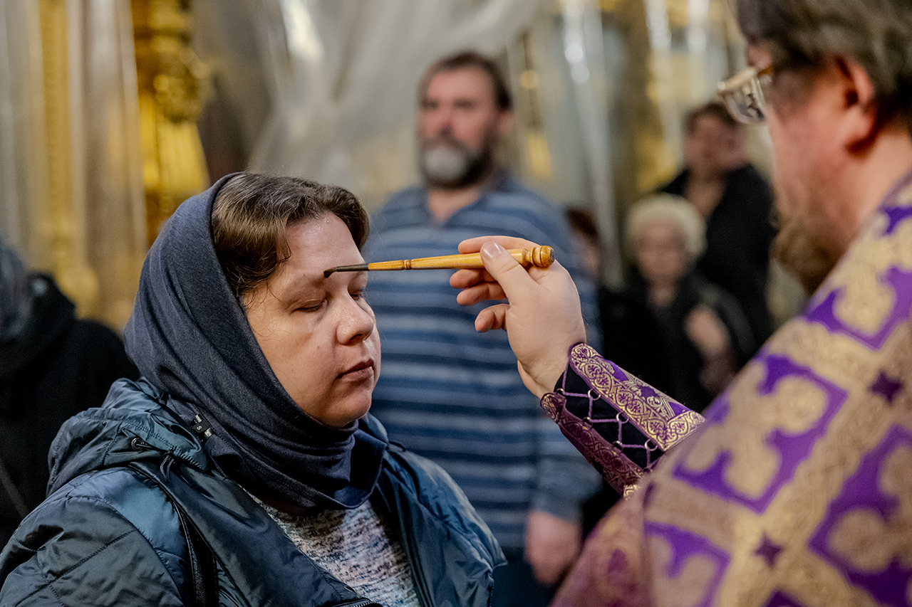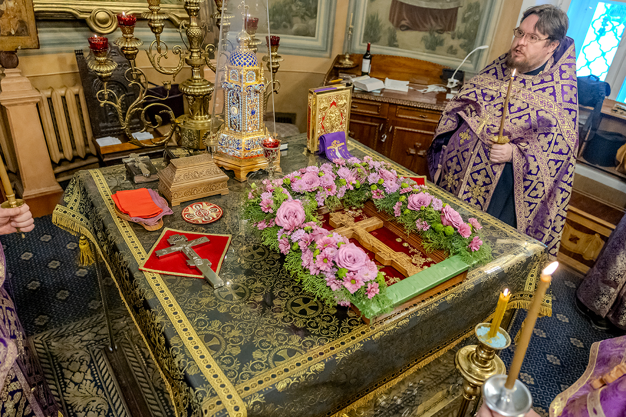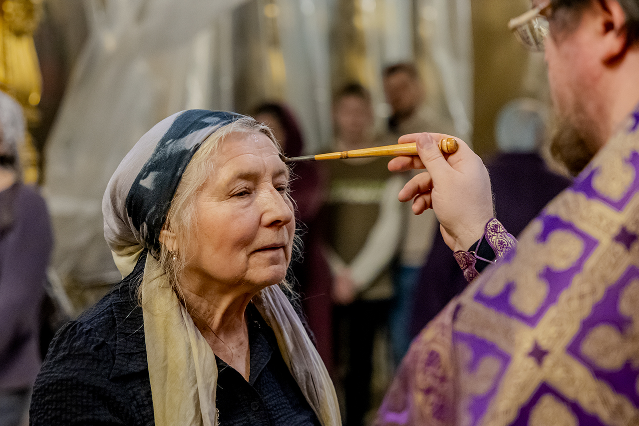После великого славословия Крест Господень был торжественно изнесен из алтаря в центр храма под пение «Кресту Твоему покланяемся, Владыко, и Святое Воскресение Твое славим». Молящиеся в храме приложились ко Кресту, всех помазали освященным елеем.