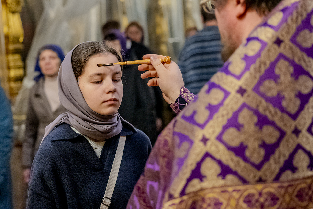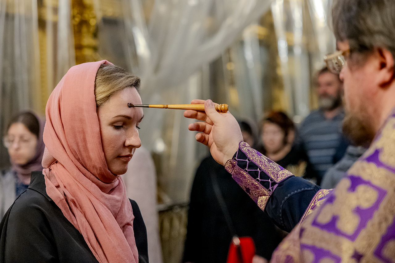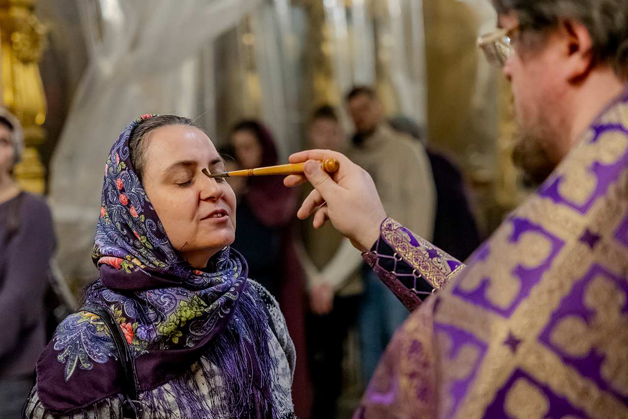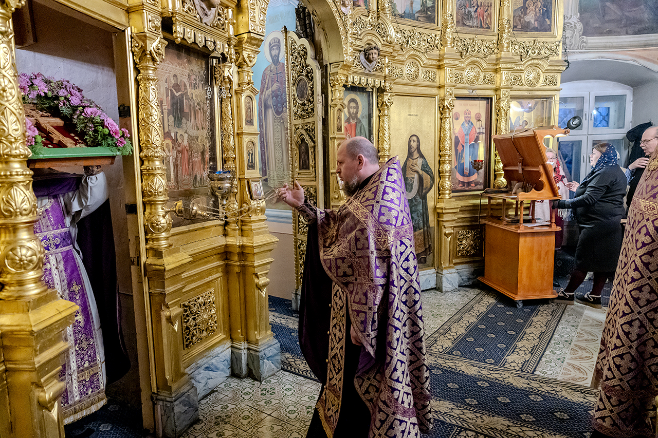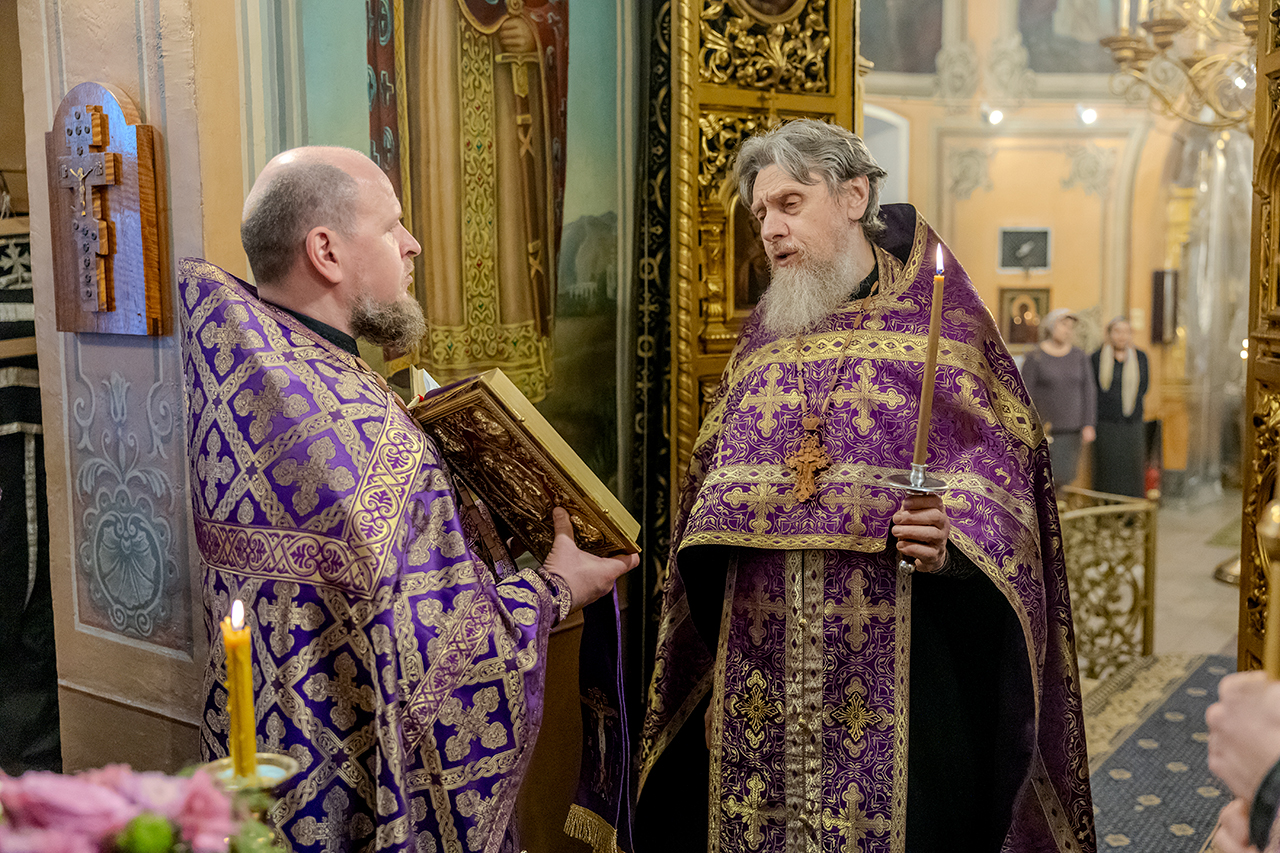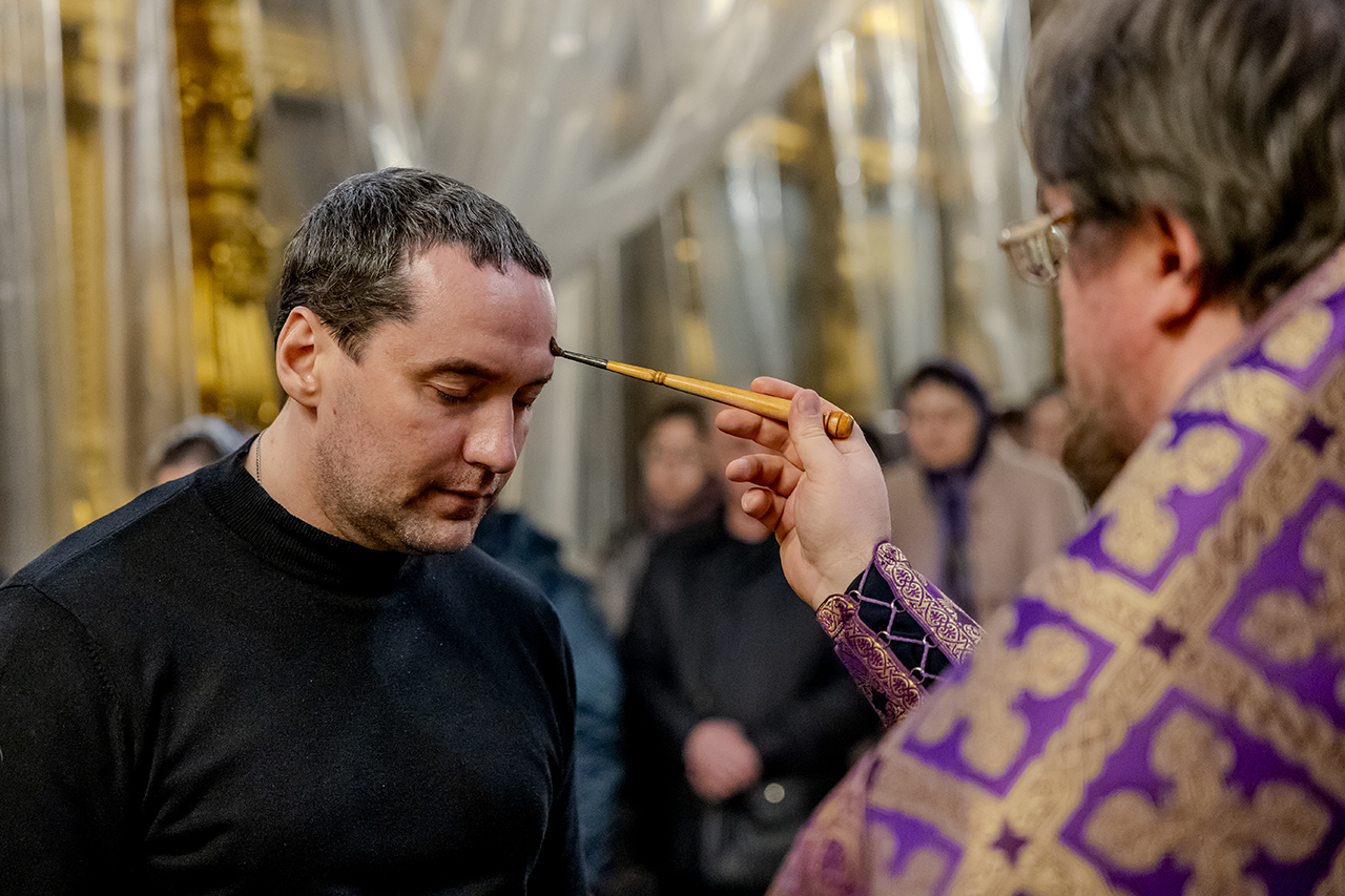 После великого славословия Крест Господень был торжественно изнесен из алтаря в центр храма под пение «Кресту Твоему покланяемся, Владыко, и Святое Воскресение Твое славим». Молящиеся в храме приложились ко Кресту, всех помазали освященным елеем.