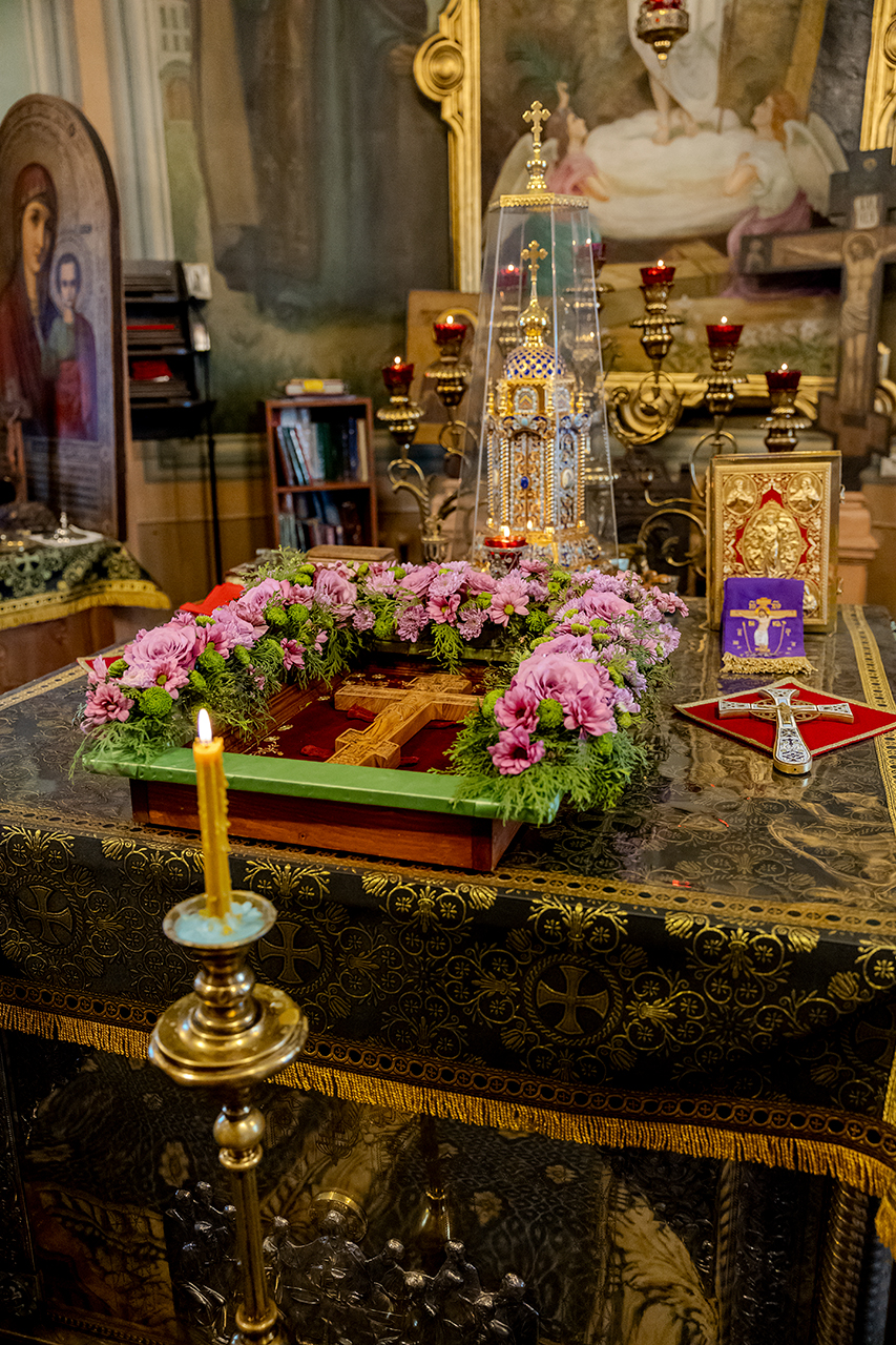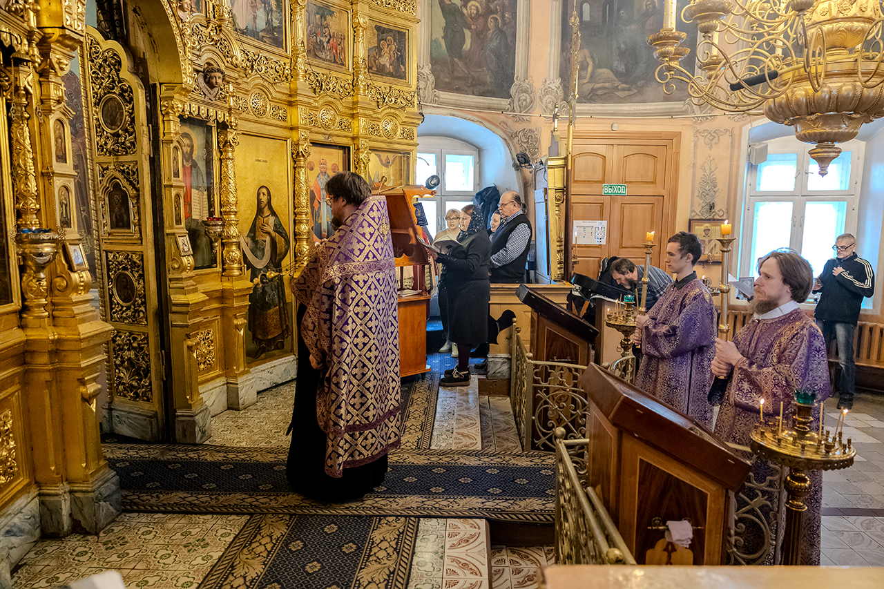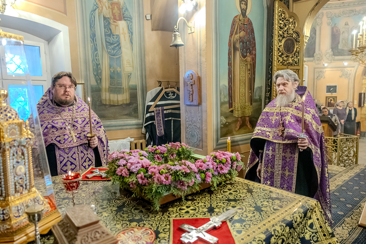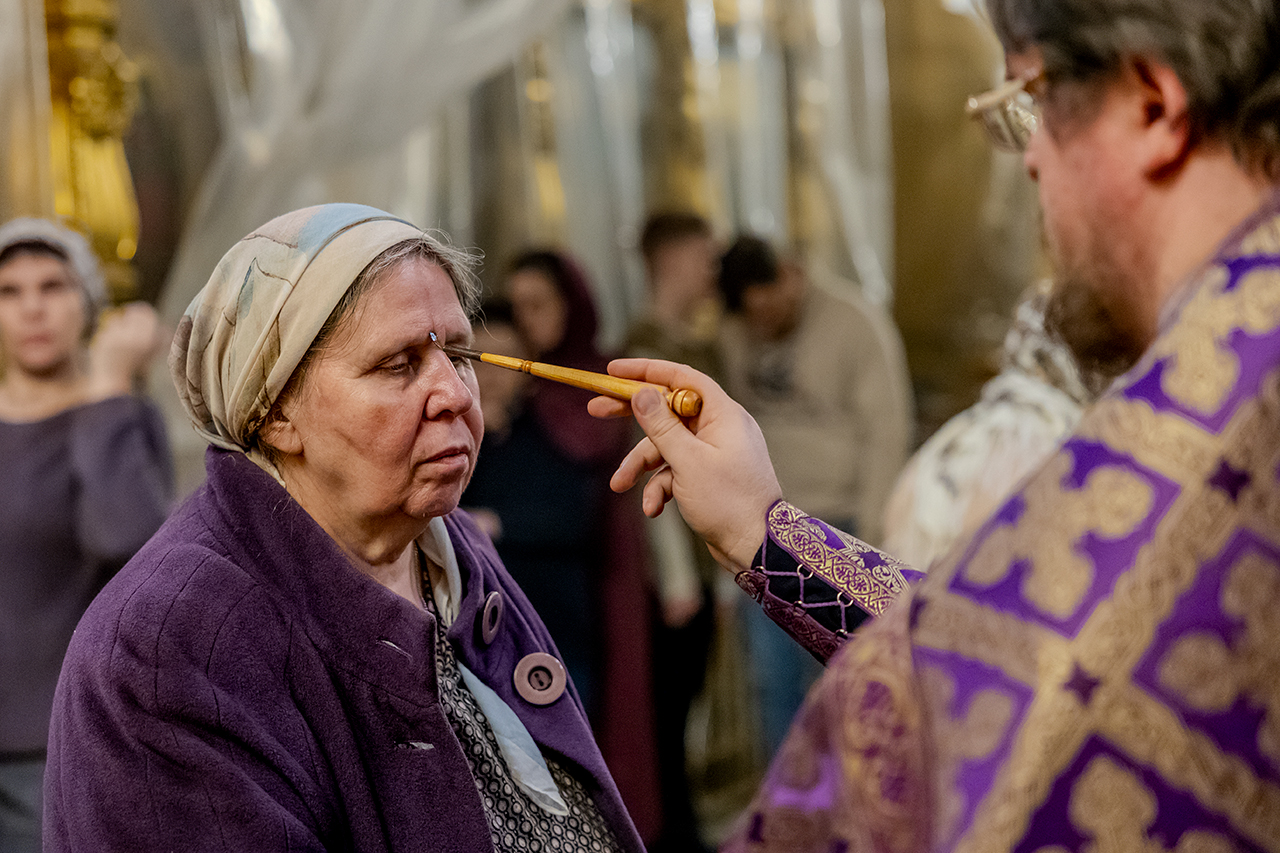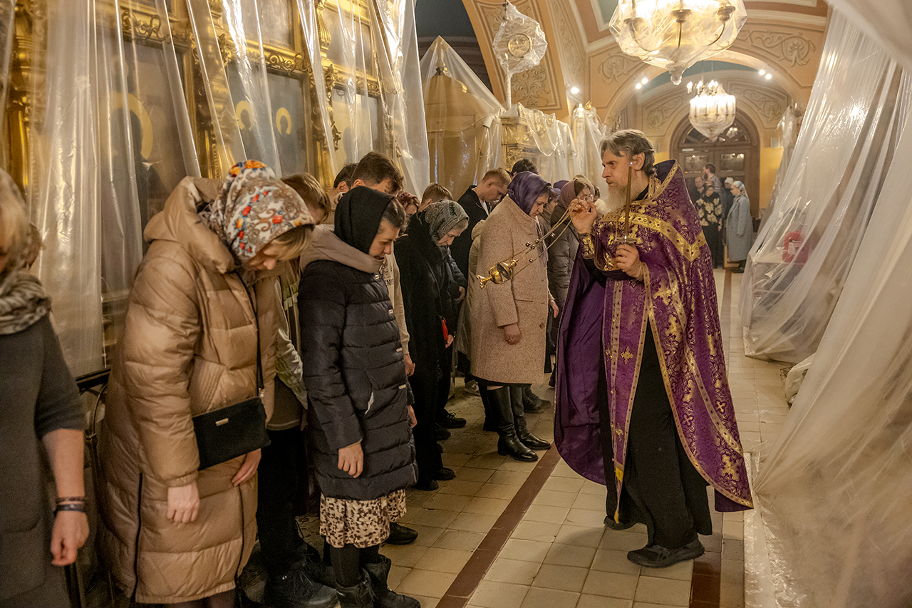 После великого славословия Крест Господень был торжественно изнесен из алтаря в центр храма под пение «Кресту Твоему покланяемся, Владыко, и Святое Воскресение Твое славим». Молящиеся в храме приложились ко Кресту, всех помазали освященным елеем.