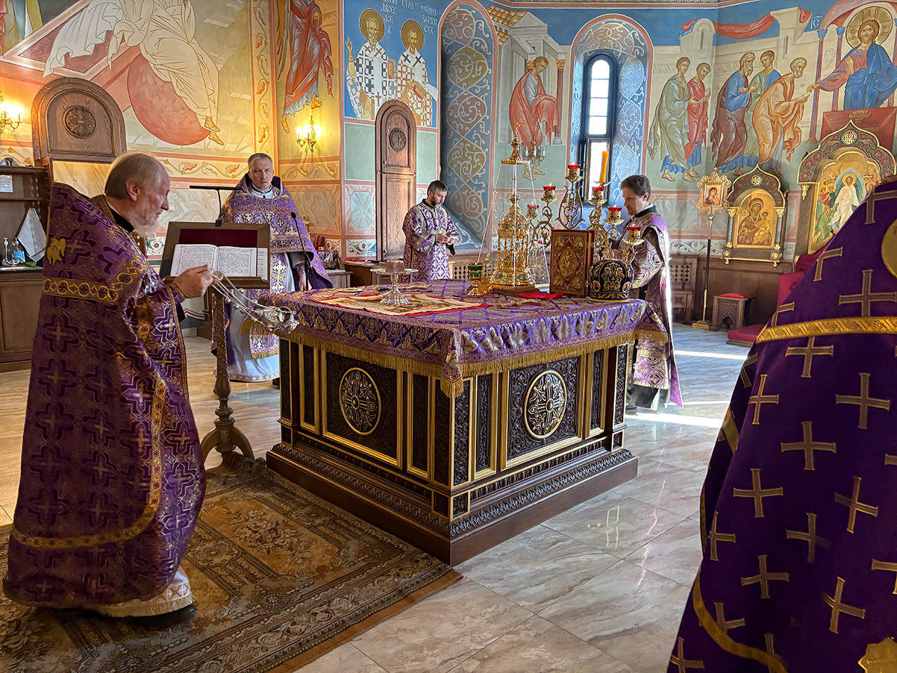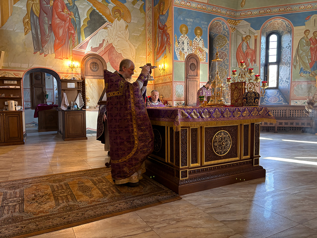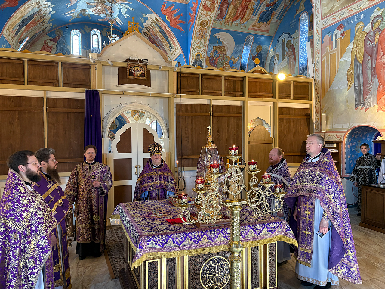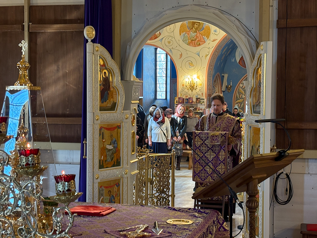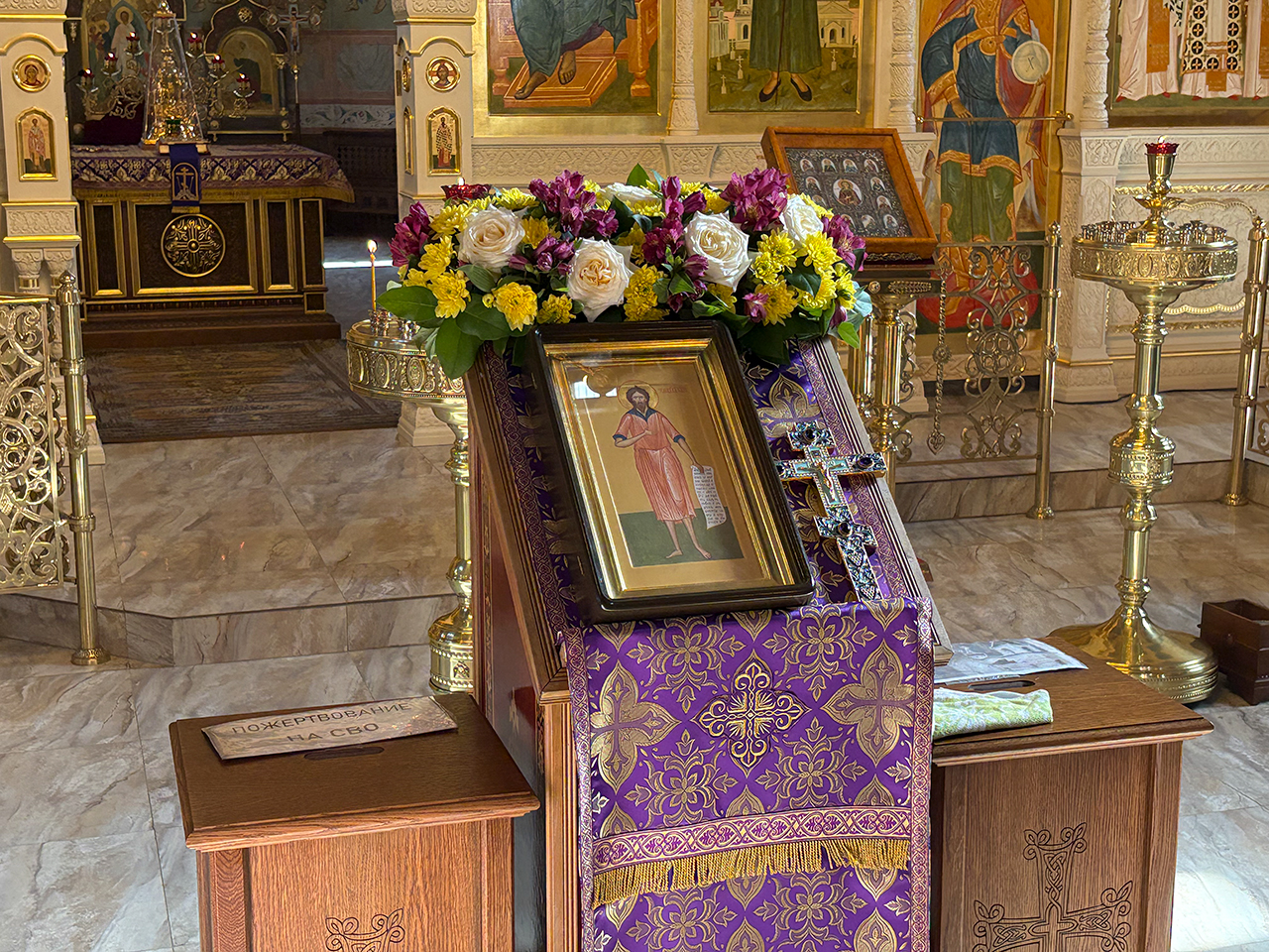 После Божественной Литургии было совершено праздничное славление, после которого отец Андрей обратился к священнослужителям и прихожанам со словами поздравления с престольным праздником.