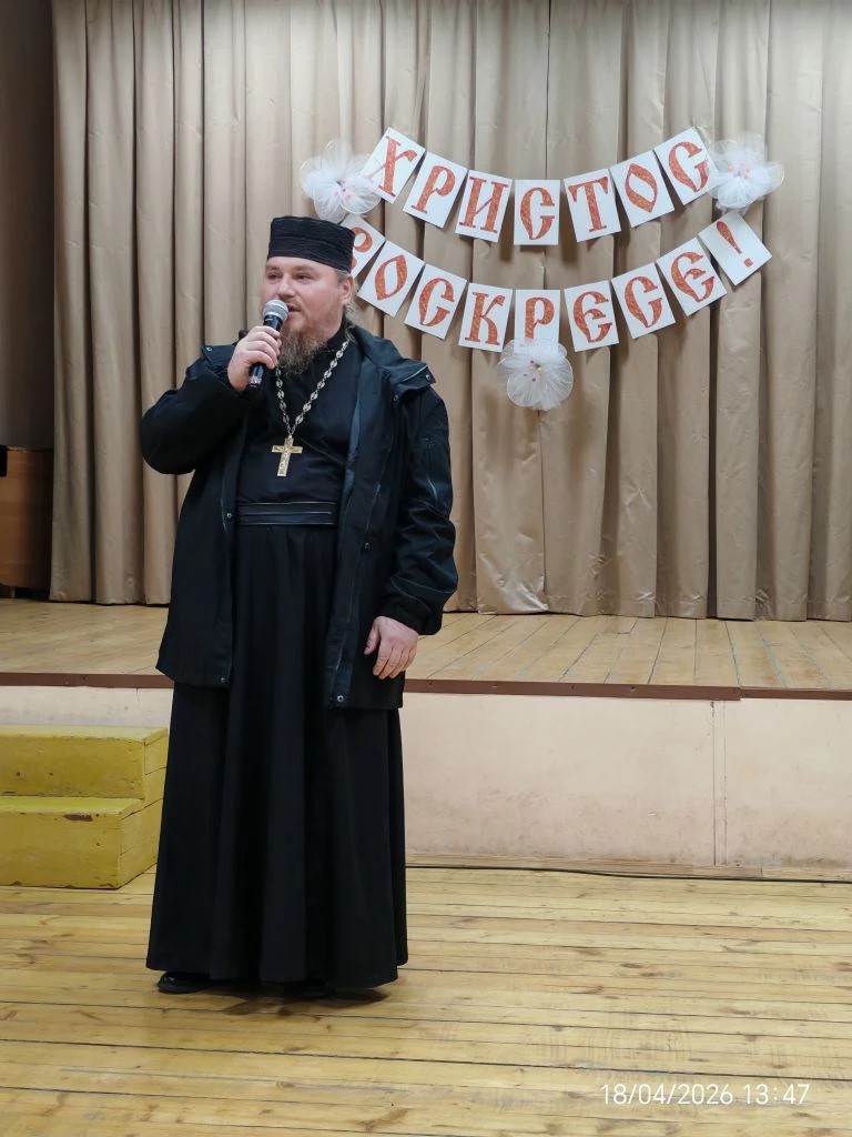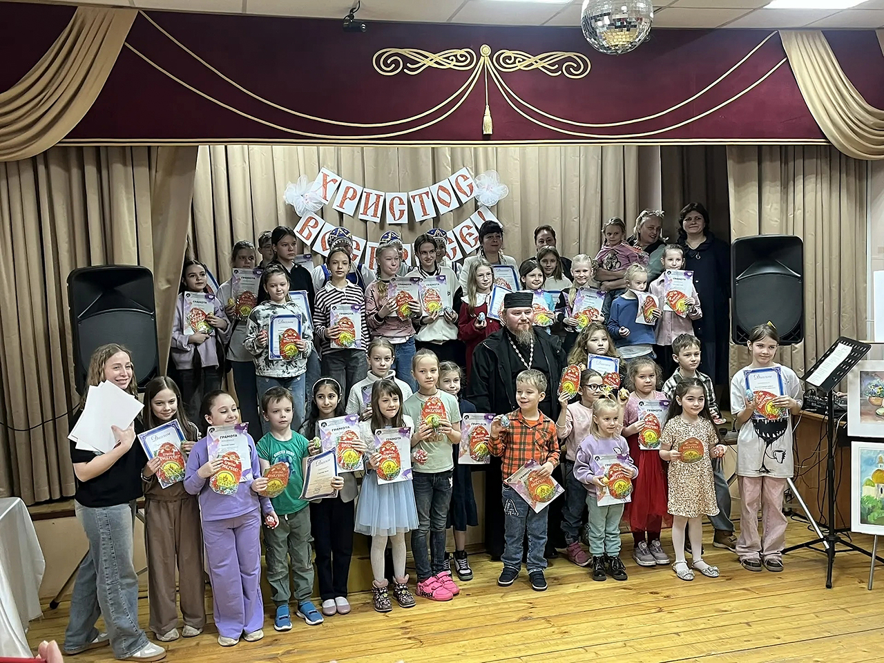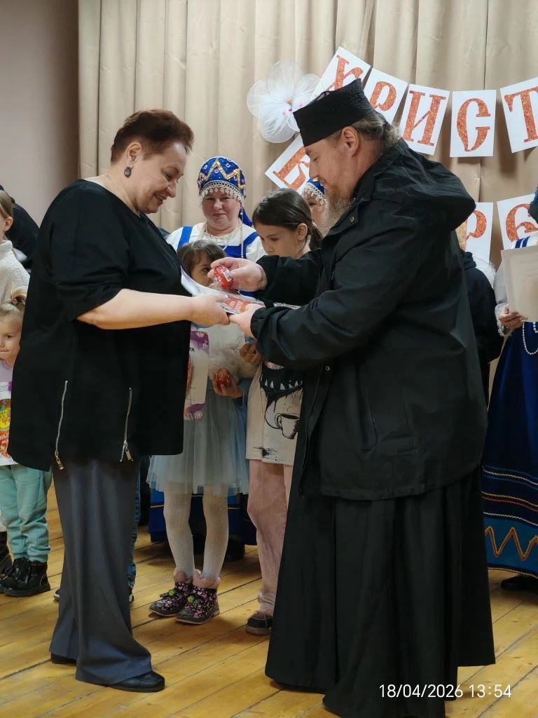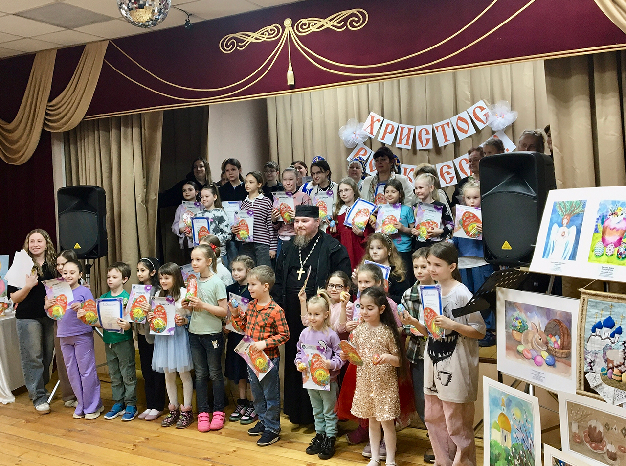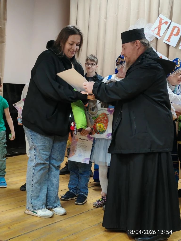 Далее настоятель Боголюбского храма иеромонах Никон (Сайфулин) поздравил собравшихся со Светлым Христовым Воскресением и поблагодарил участников конкурса за участие. Каждому была вручена грамота, шоколадное Пасхальное яйцо и книжка о празднике Святой Пасхи.