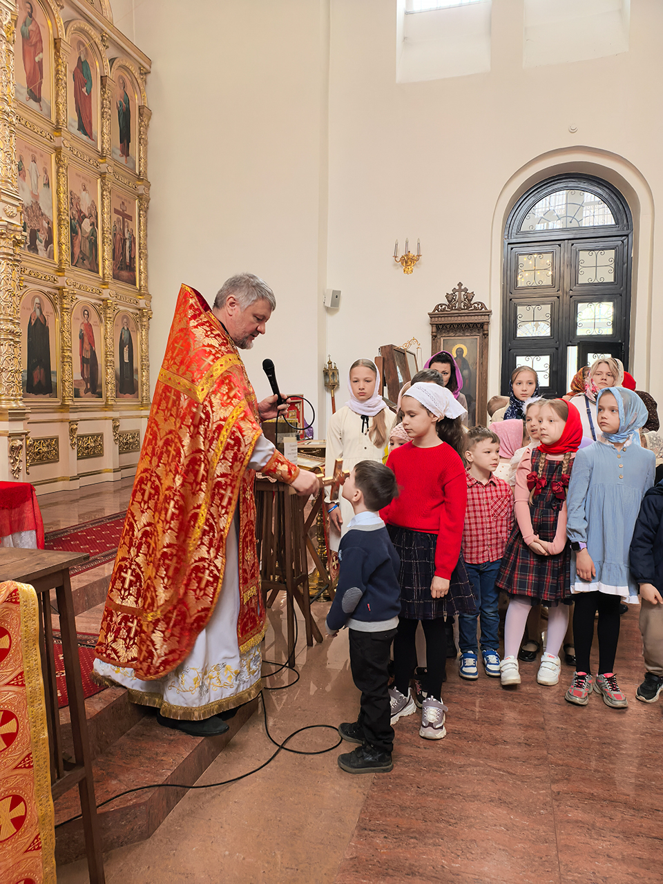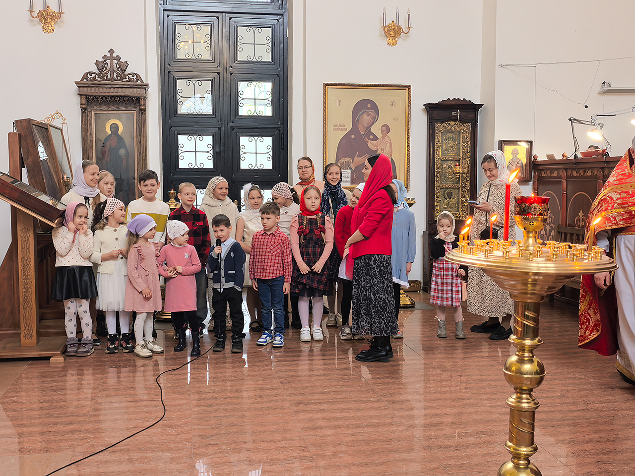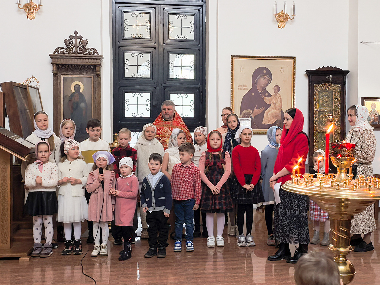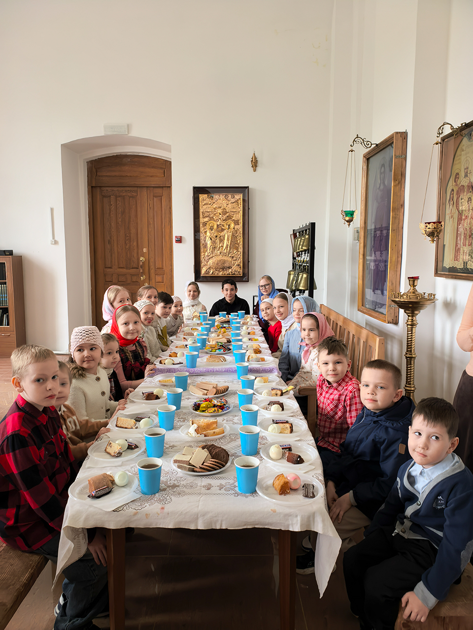 Воспитанники приходской воскресной школы исполнили праздничный пасхальный тропарь, прославили Воскресшего Христа в песнях и стихотворениях. После выступления детей состоялось чаепитие, и все желающие могли позвонить в колокола по пасхальной традиции.