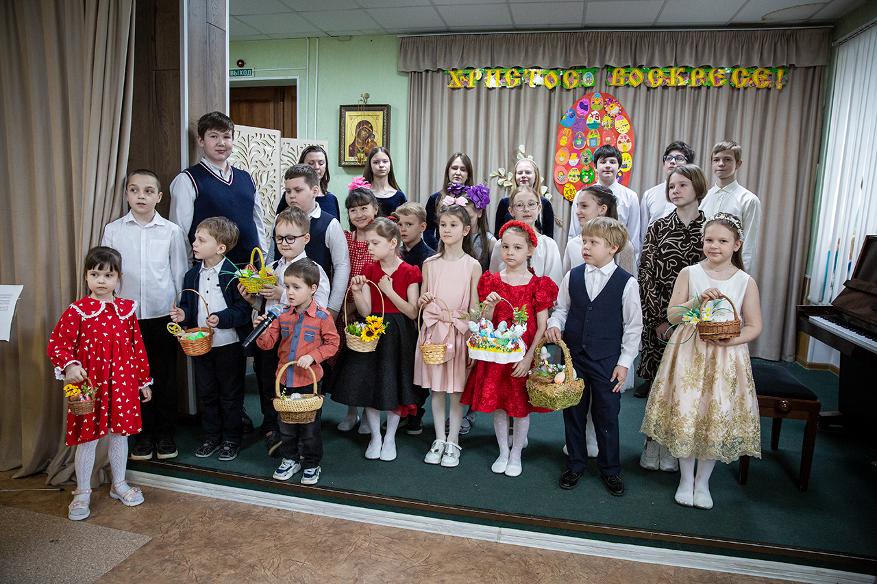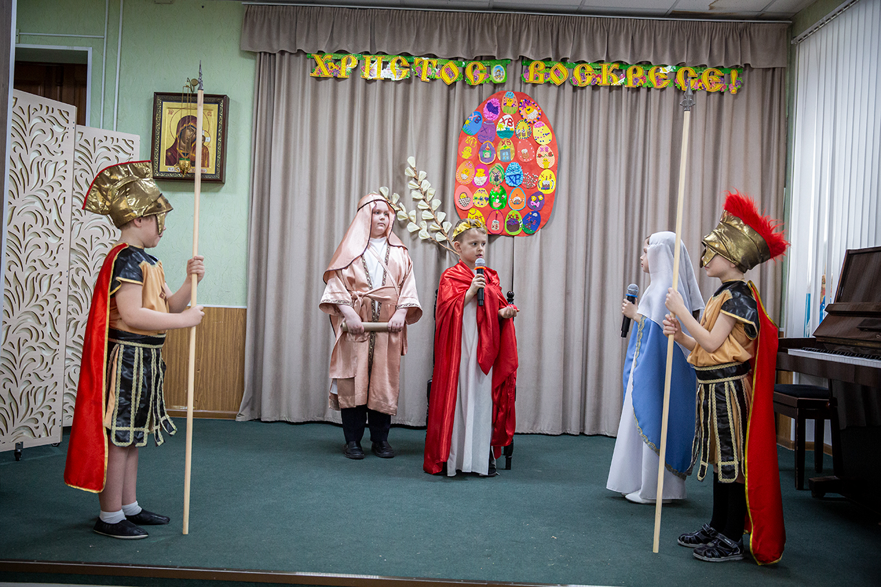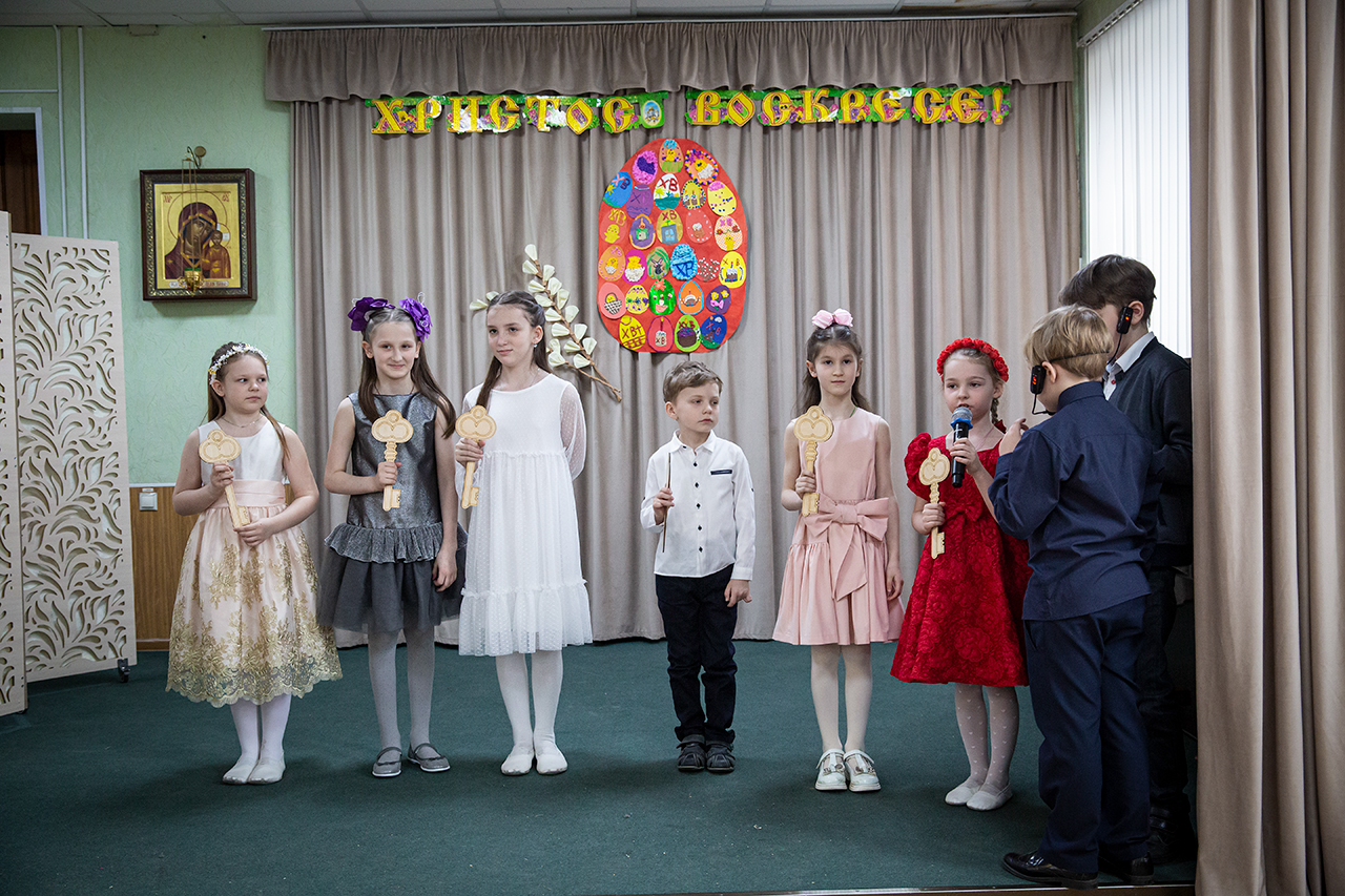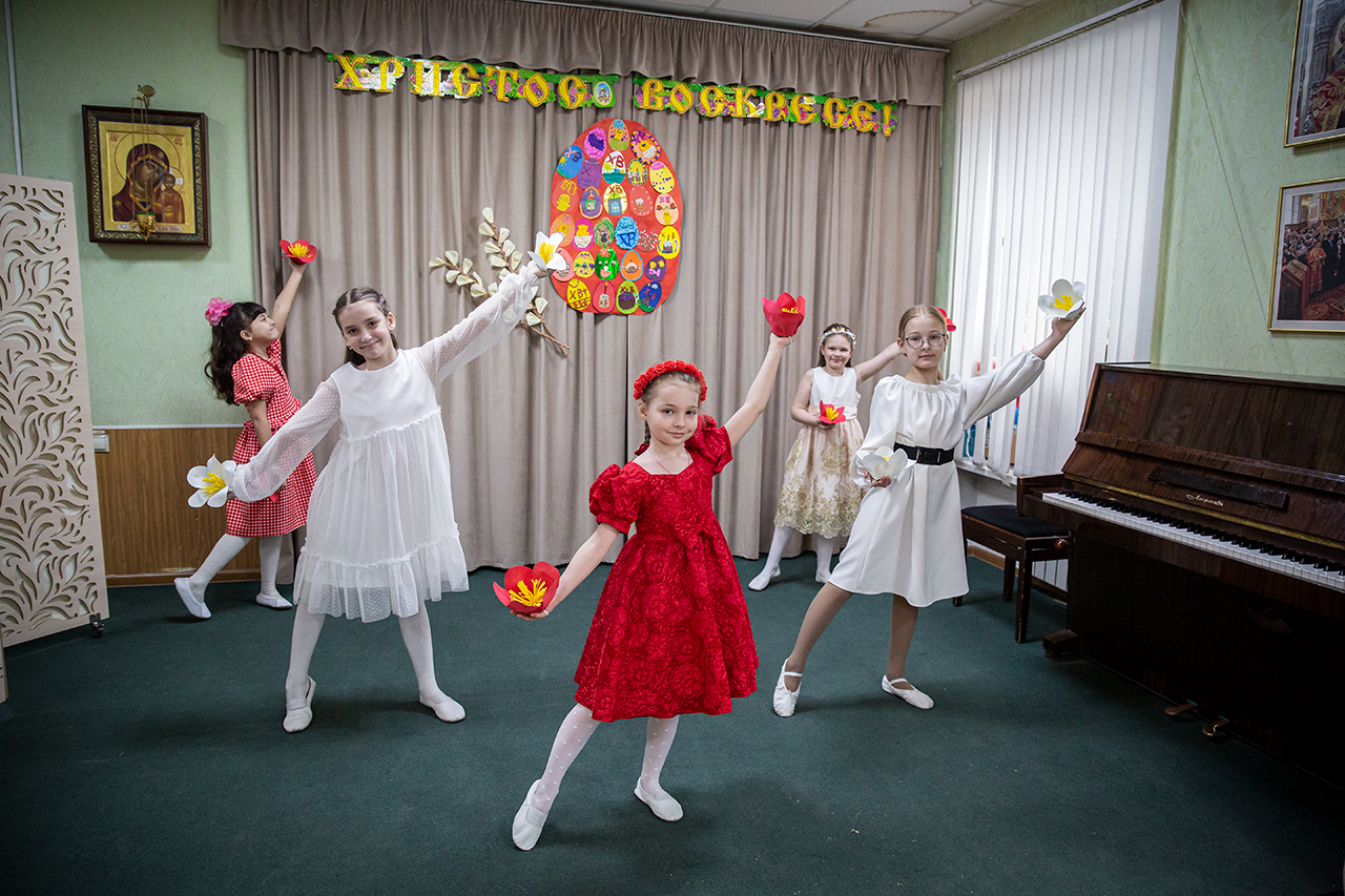После участия детей в Божественной Литургии, на которой ребята старшей группы пели в составе клиросного хора, в конференц-зале состоялся праздничный концерт. Программа выступлений включала сценки «Встреча Марии Магдалины с императором Тиберием», «Ключи от рая», исполнение «Вальса цветов», песен, чтение стихов.
