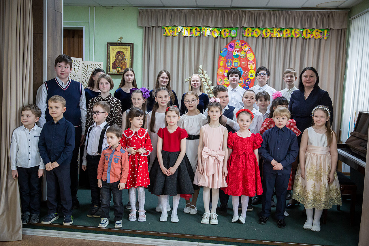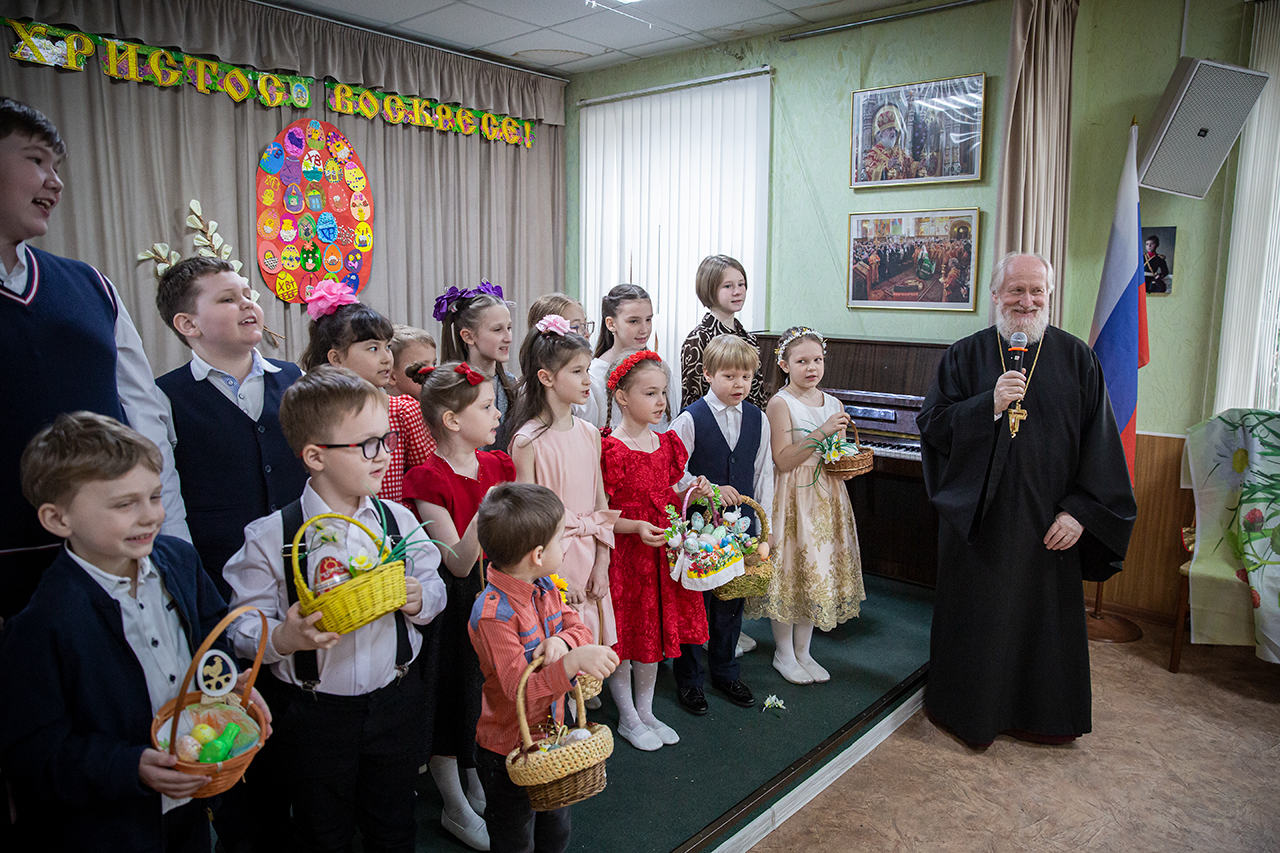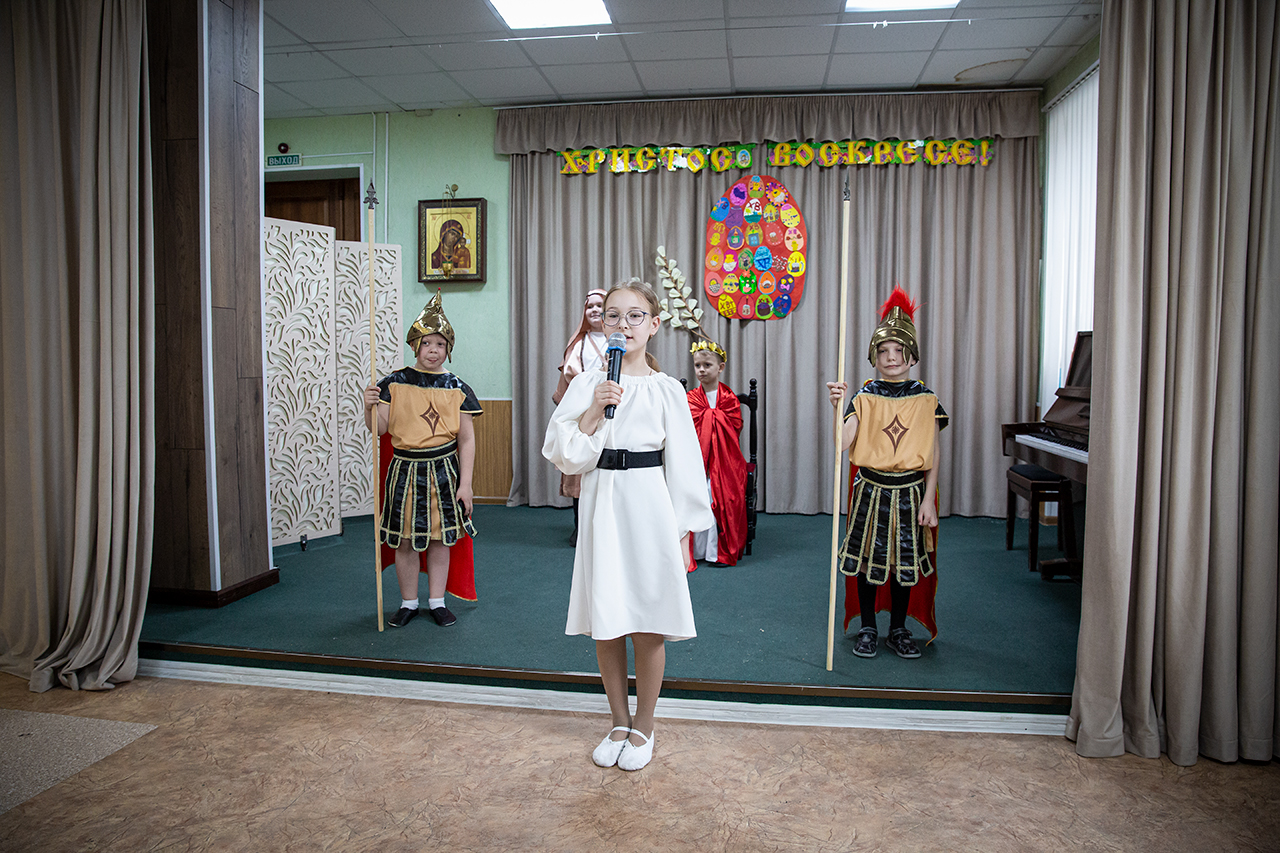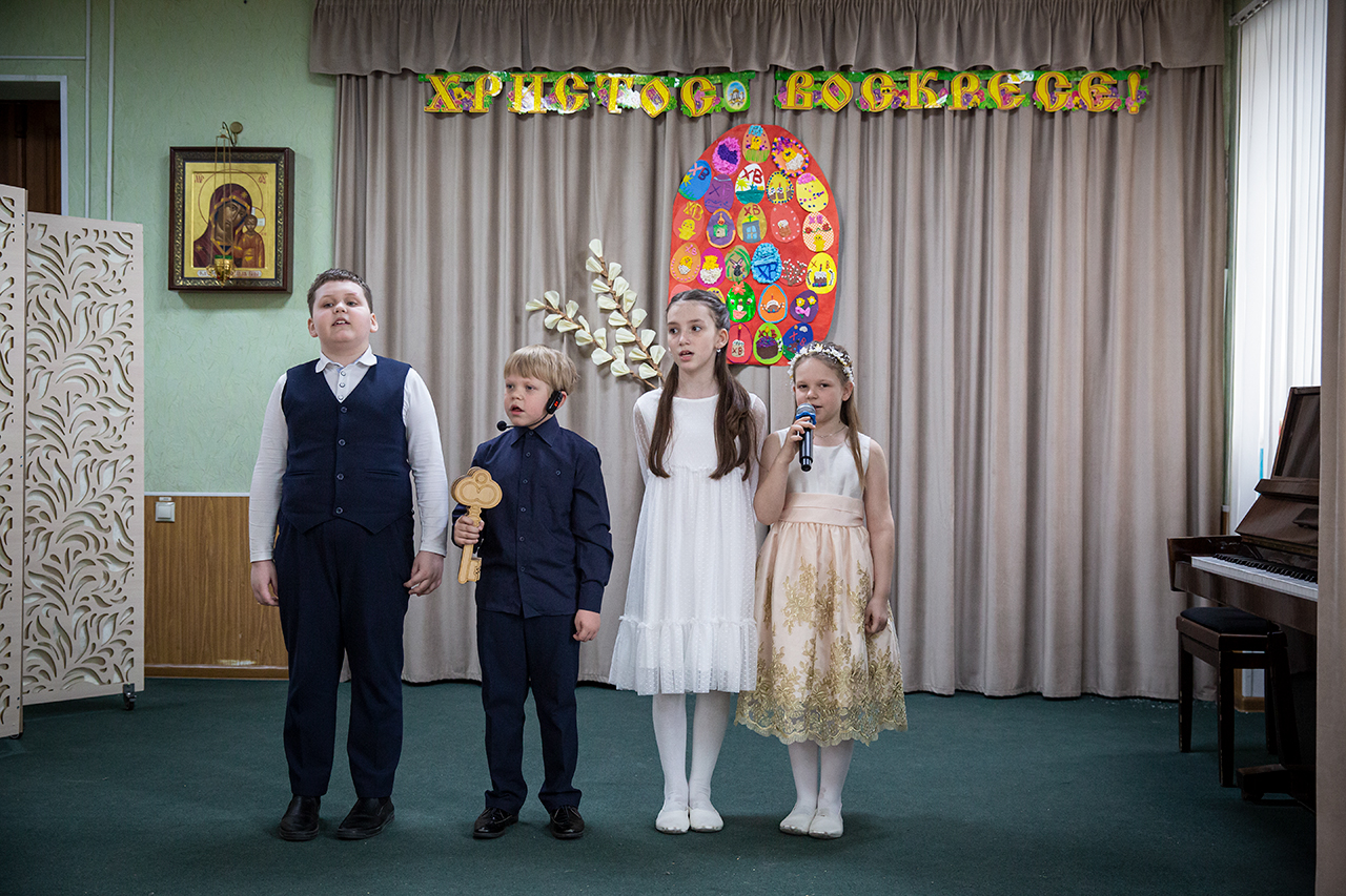 После участия детей в Божественной Литургии, на которой ребята старшей группы пели в составе клиросного хора, в конференц-зале состоялся праздничный концерт. Программа выступлений включала сценки «Встреча Марии Магдалины с императором Тиберием», «Ключи от рая», исполнение «Вальса цветов», песен, чтение стихов.