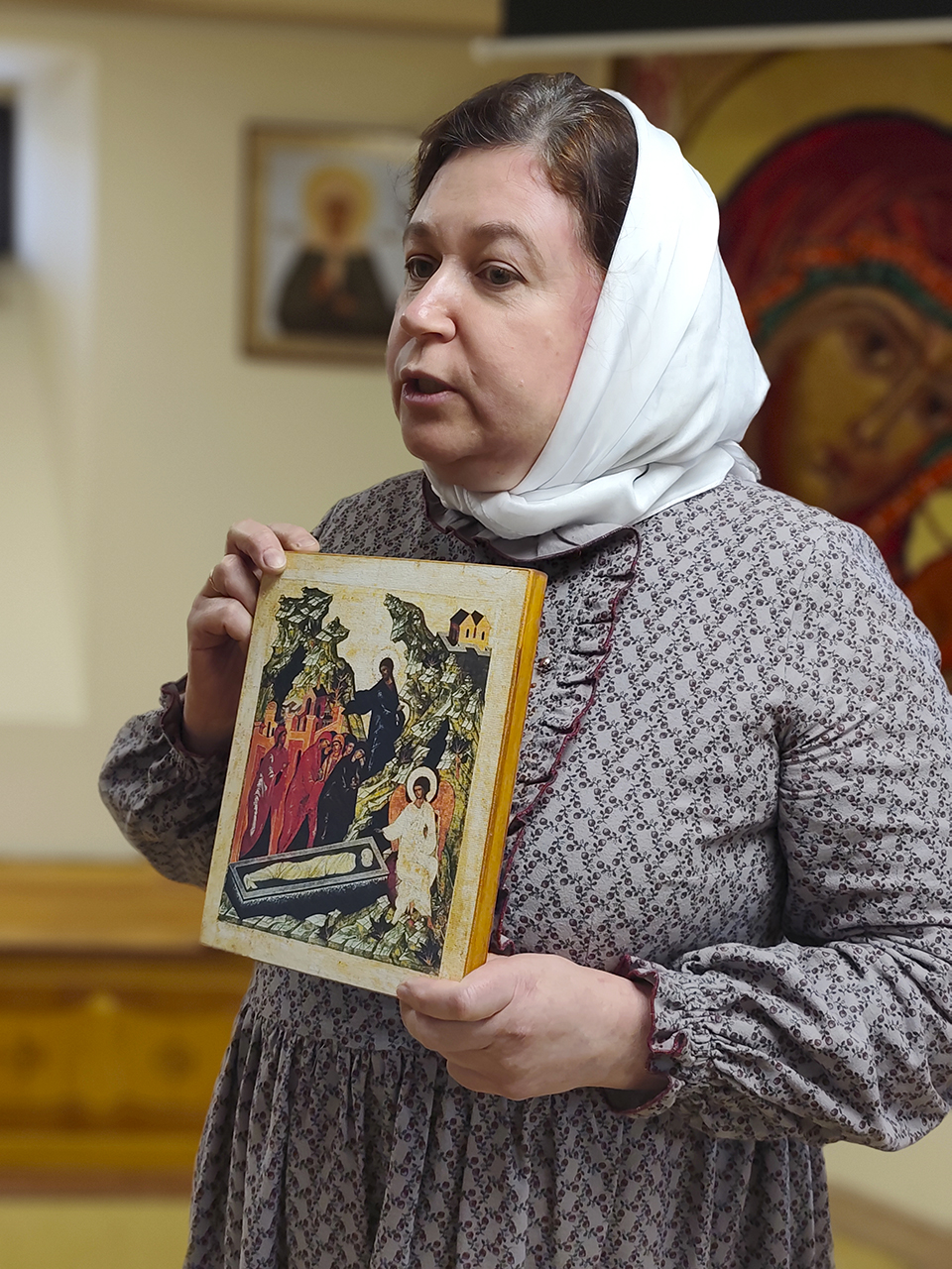 О возникновении праздника и его духовном значении рассказала преподаватель Н.Г. Овчинникова. Евангельский сюжет о Воскресении Христа был дополнен разбором икон «Сошествие во ад» и «Жёны-мироносицы у гроба Спасителя».