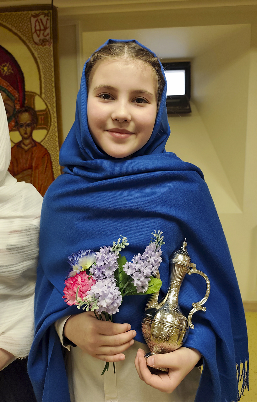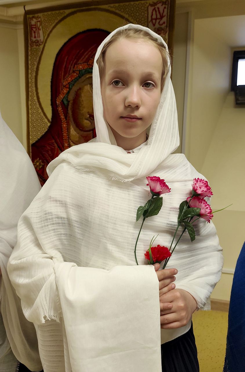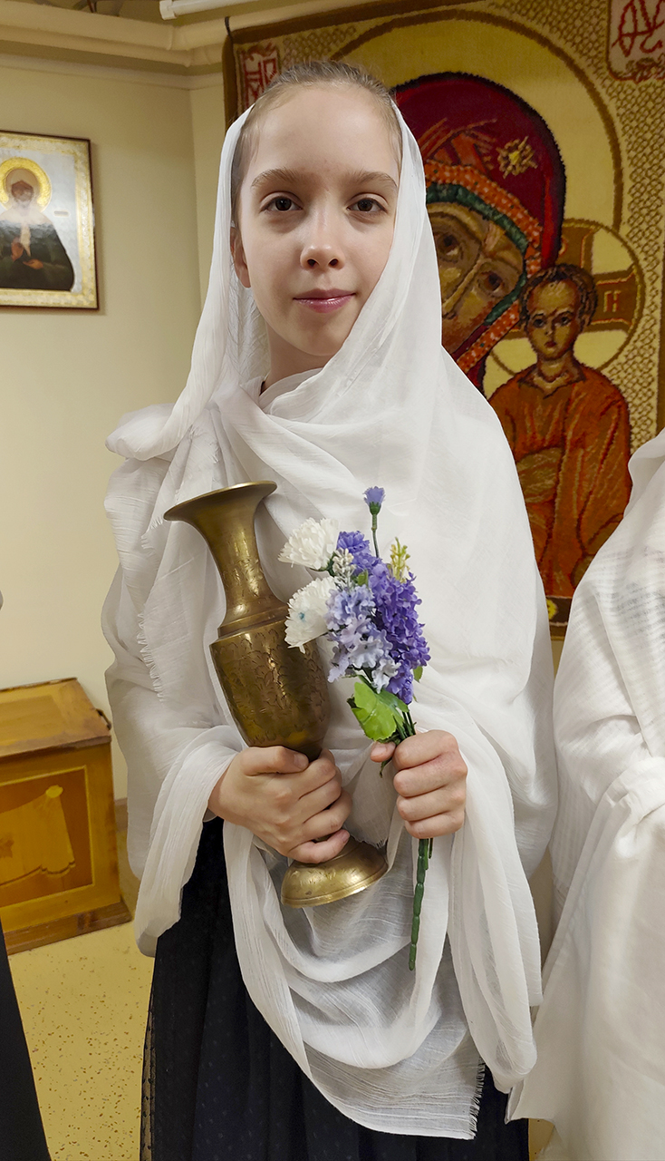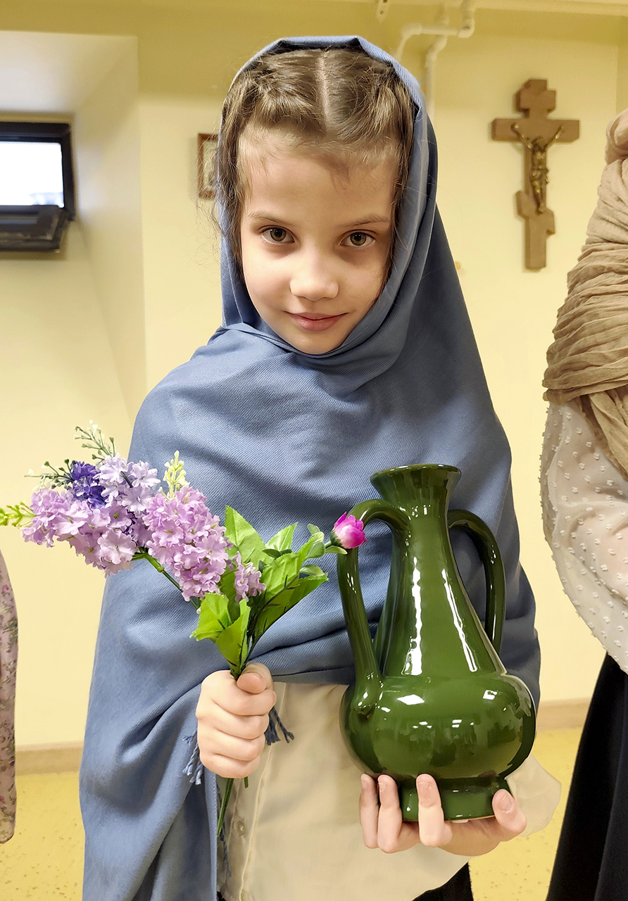 Воспитанницы средней группы представили жён-мироносиц в лицах, рассказав об их семьях и деятельности во время проповеди Господа и после Его вознесения.
