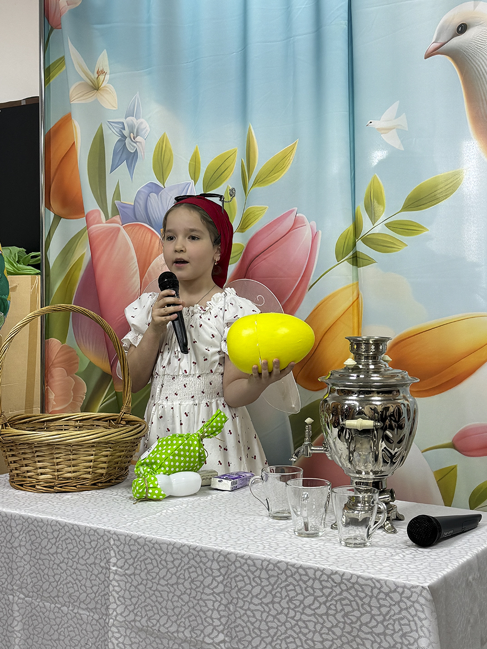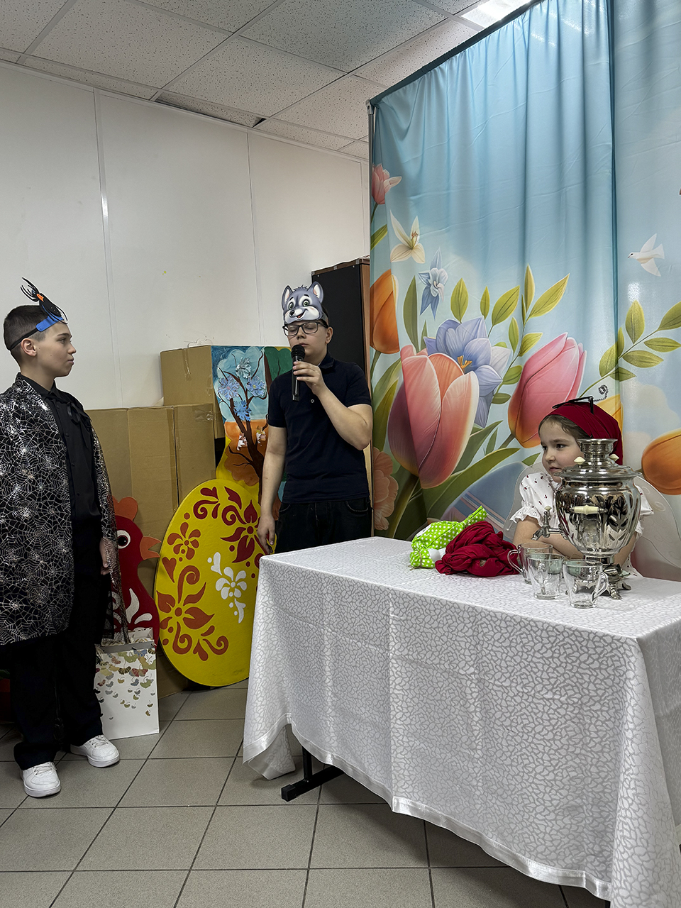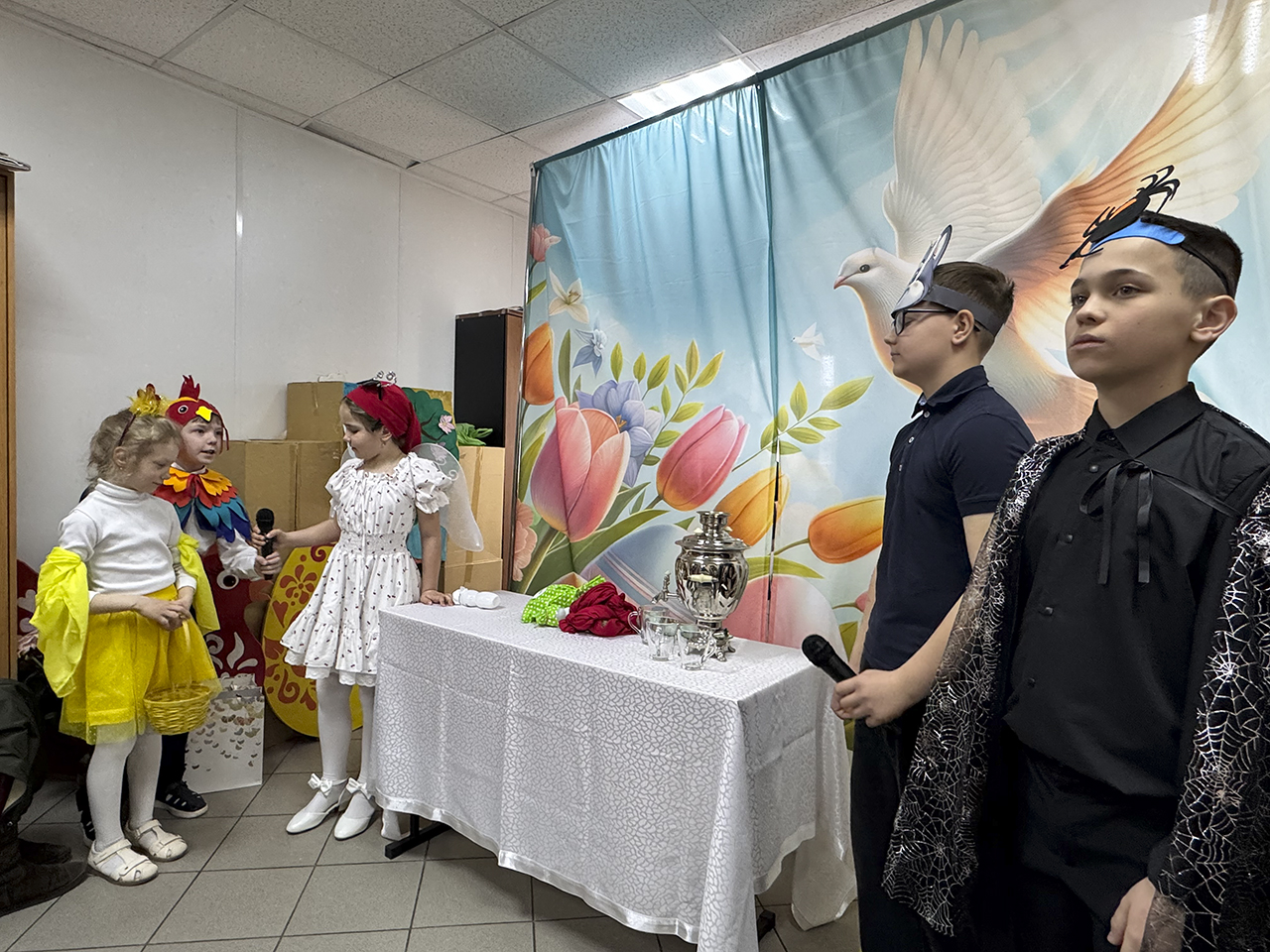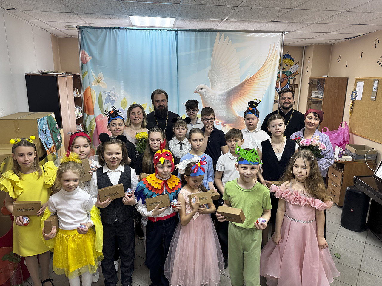 Воспитанники подготовили пасхальную сказку под названием «Муха-цокотуха». После выступления настоятель храма священник Витали Крикота подарил ребятам сладкие подарки.