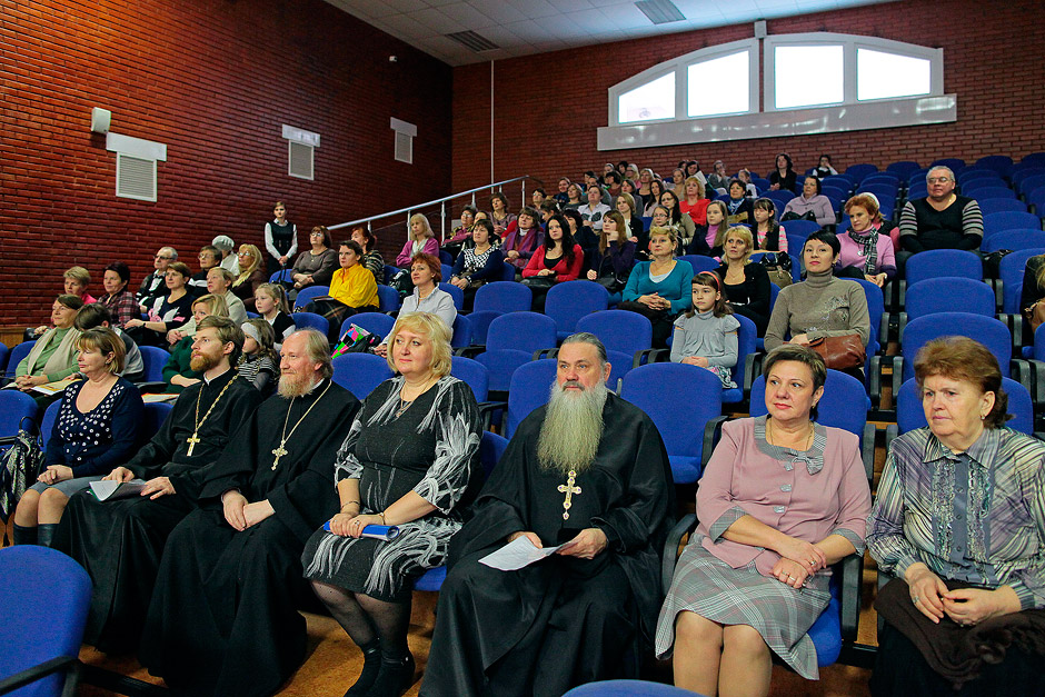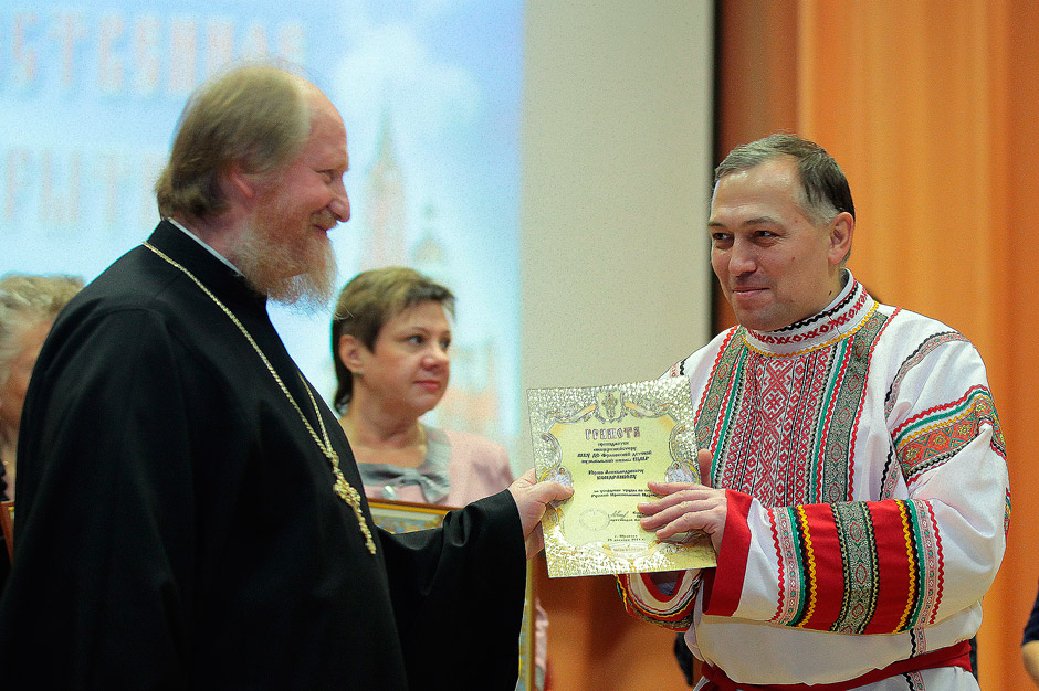 В актовом зале зазвучала музыка, и все участники заняли свои почетные места. Был показан отрывок из кинофильма о преподобном Сергии Радонежском, а затем учащиеся средней школы № 14 им. Ю.А. Гагарина вместе со своим учителем В.И. Ефименко показали музыкальную композицию «Творя память преподобного». С приветственными словами к педагогам, священнослужителям и школьникам обратились заместитель Главы Щелковского муниципального района, председатель Комитета по вопросам образования и делам молодежи Н.В. Суровцева, благочинный церквей Щелковского округа протоиерей Андрей Ковальчук. На сцене прошло награждение работников образовательных учреждений и учреждений культуры, особенно активно потрудившихся на ниве духовного просвещения детей и молодежи. Благословенными грамотами митрополита Крутицкого и Коломенского были награждены начальник отдела развития дополнительного образования и воспитания Комитета по вопросам образования Щелковского района Е.В. Зыбина, директор средней общеобразовательной школы № 12 М.П. Мирошниченко, заместитель заведующего по воспитательной методической работе Центра развития ребенка А.В. Митрохина, депутат районного Совета депутатов, председатель Совета ветеранов образования Щелковского муниципального района Р.М. Никитина, коллектив Межпоселенческой центральной районной библиотеки и ее директор Е.В. Ильенко.
