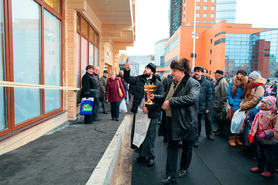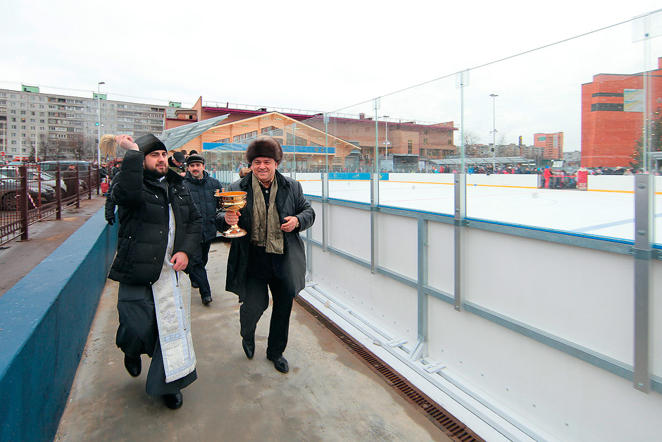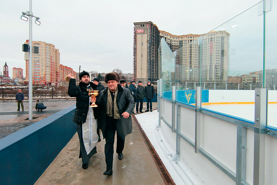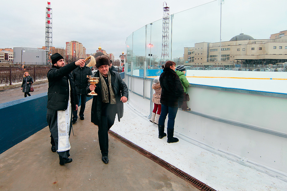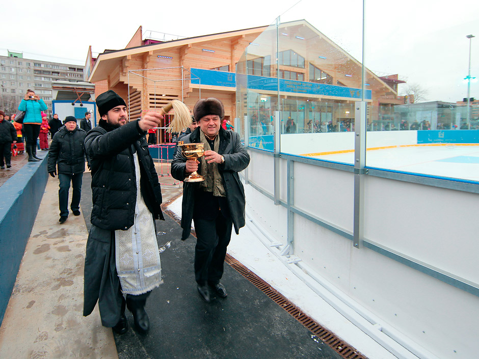 Клирик Серафимо Саровской церкви г. Щелкова, приписанной к храму мученика Иоанна Воина д. Никифорово, священник Виталий Крикота совершил молитву на начало благого дела, окропив каток святой водой.