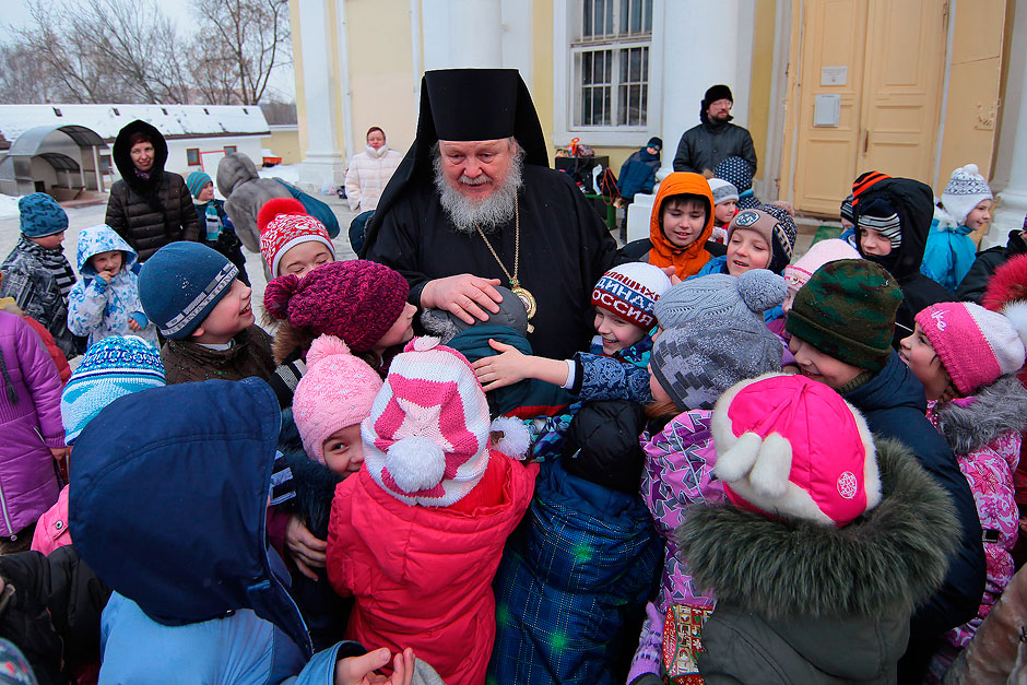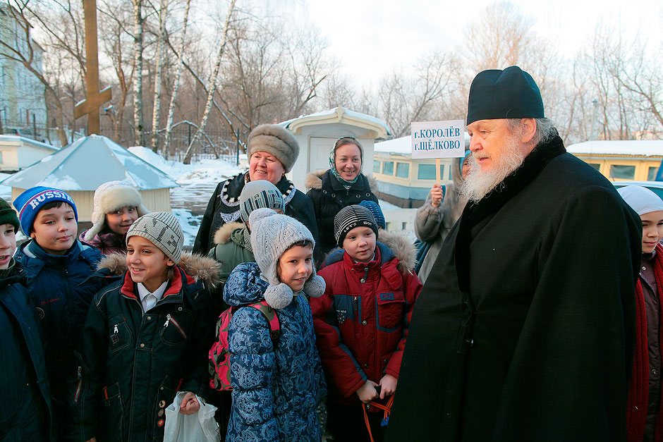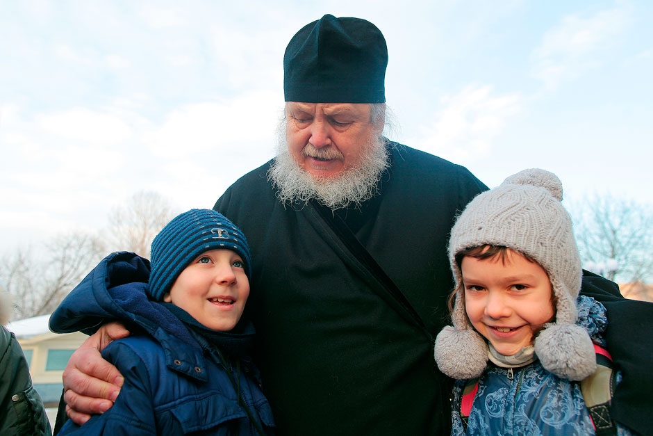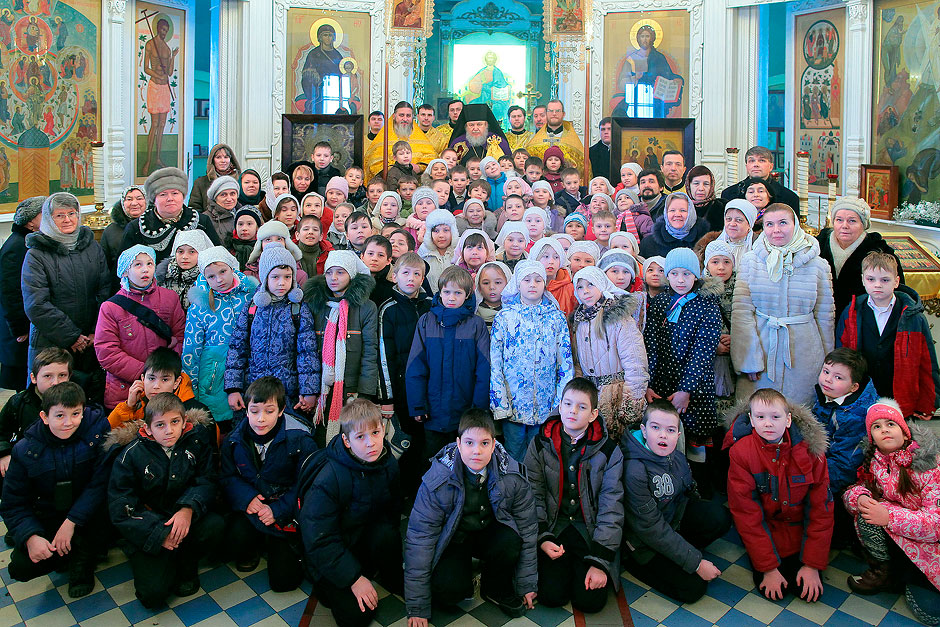 После литургии на улице перед храмом ребята дружно общались и фотографировались. Владыка Николай благословлял детей и шутливо расспрашивал их про учебу.